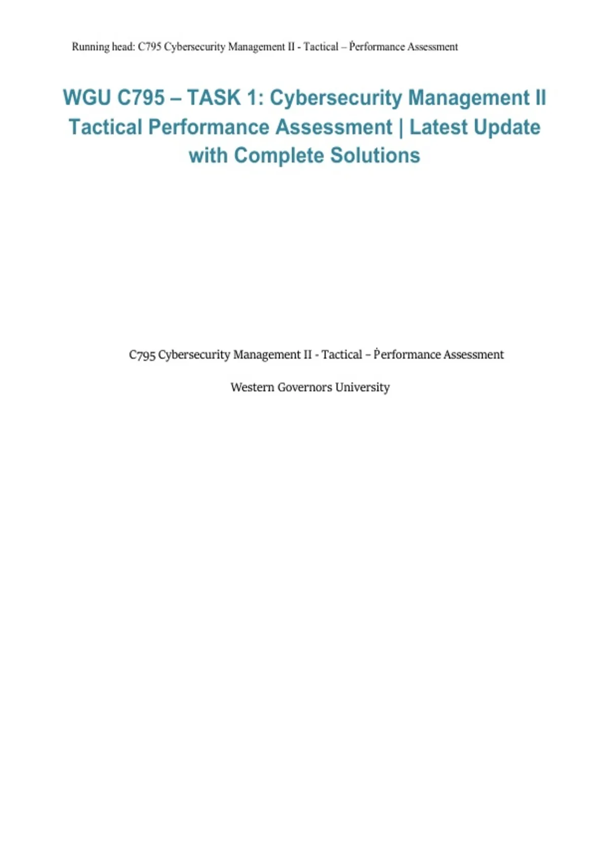 This document provides a fully updated and complete solution for WGU C795 Task 1: Cybersecurity Management II – Tactical Performance Assessment. It addresses tactical cybersecurity planning, risk assessment, control implementation, incident response, and alignment with organizational security objectives. The content is structured to meet WGU rubric requirements and reflects current cybersecurity management practices for the 2026/2027 academic year.