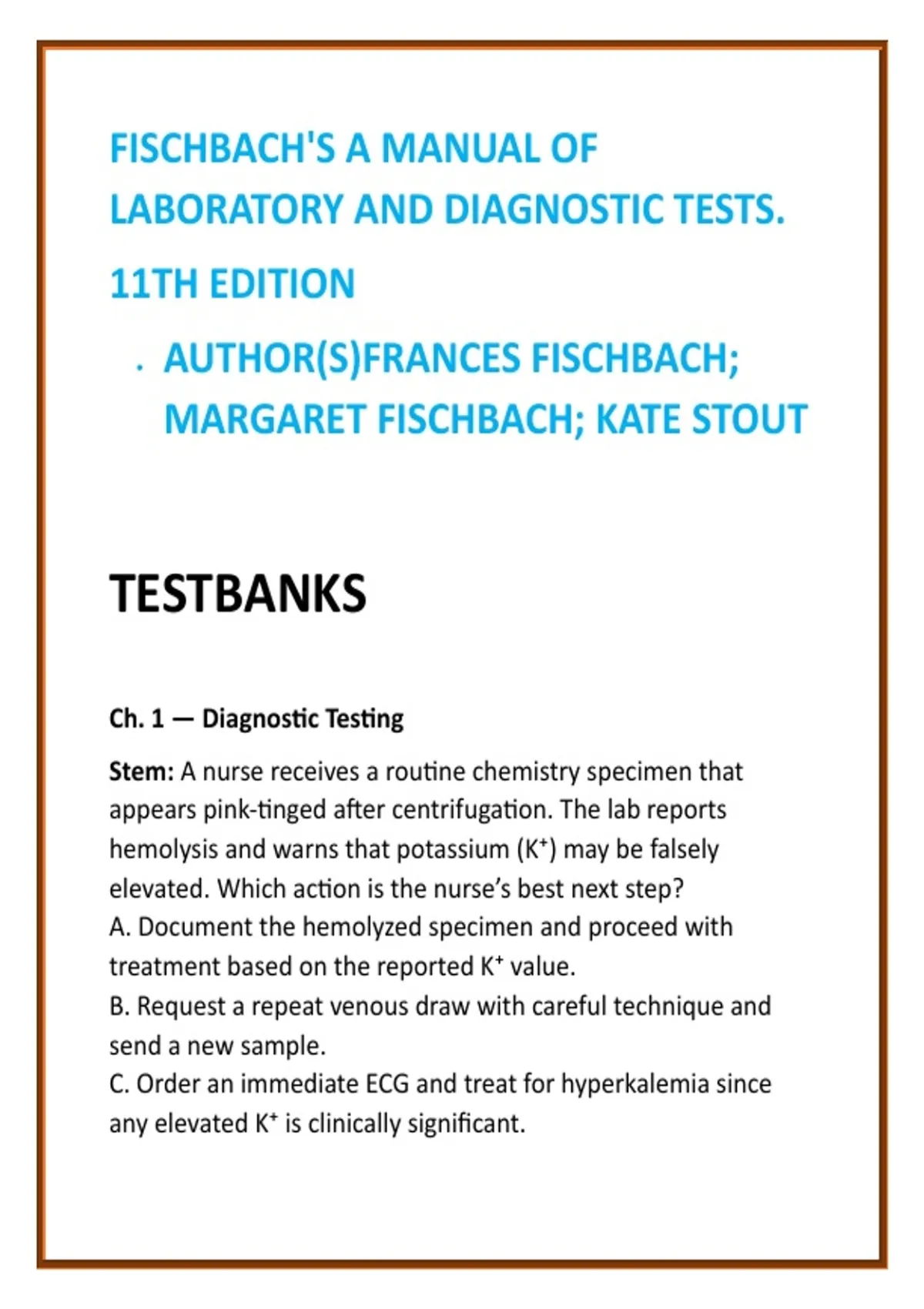 Fischbach Laboratory Test Bank Nursing Test Bank 2026 | Laboratory & Diagnostic Tests Nursing MCQs + Diagnostic Interpretation Study Guide 2) SEO Product Description (200–300 words) Master laboratory diagnostics with confidence using this comprehensive Nursing Test Bank for Fischbach’s A Manual of Laboratory and Diagnostic Tests, 11th Edition—the gold-standard reference for laboratory interpretation in nursing education. This Laboratory & Diagnostic Tests Nursing Test Bank (2026 edition) delivers full textbook coverage across ALL chapters, with 20 high-quality, exam-ready MCQs per chapter, each paired with concise, evidence-based rationales aligned directly to Fischbach’s authoritative guidance. Every question is designed to strengthen clinical judgment, diagnostic reasoning, and patient safety awareness, not simple memorization. Built specifically for modern nursing curricula, this digital test bank focuses on real-world diagnostic interpretation, including abnormal lab values, specimen collection errors, patient preparation requirements, critical values, and urgent clinical decision-making. It helps students reduce clinical errors, interpret results accurately, and enter exams and clinical placements fully prepared. What You’ll Gain Faster, more efficient study with structured chapter-by-chapter MCQs Improved interpretation of laboratory values and diagnostic results Stronger understanding of patient preparation and specimen handling Greater confidence in identifying critical findings and next nursing actions Ideal For Laboratory & Diagnostic Tests in Nursing Health Assessment & Diagnostics Clinical Nursing Practice Medical-Surgical Nursing (diagnostics components) PN/LPN, ADN, and BSN programs Product Features FULL chapter-by-chapter coverage (11th Edition) 20 laboratory-focused MCQs per chapter Verified rationales grounded in Fischbach’s Manual Emphasis on clinical interpretation, safety, and patient teaching Perfect for exams, quizzes, NCLEX-style prep, and clinical readiness If you want a trusted, exam-proven diagnostic test bank built on Fischbach’s lab expertise, this is the definitive study resource. 3) 8 High-Value SEO Keywords Fischbach laboratory test bank laboratory and diagnostic tests nursing MCQs nursing diagnostic test interpretation Fischbach lab values review laboratory values nursing study guide diagnostic testing nursing test bank nursing lab interpretation questions clinical diagnostics nursing exam prep 4) 10 Hashtags #FischbachTestBank #NursingDiagnostics #LaboratoryNursing #DiagnosticTestsNursing #NursingMCQs #LabValuesNursing #ClinicalNursingPrep #MedicalSurgicalNursing #NursingExamResources #NursingTestBank2026
