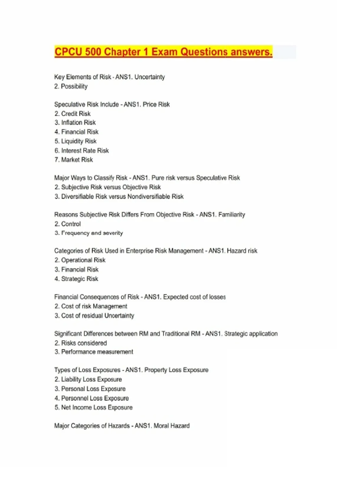 CPCU 500 Chapter 1 Exam Questions answers.
