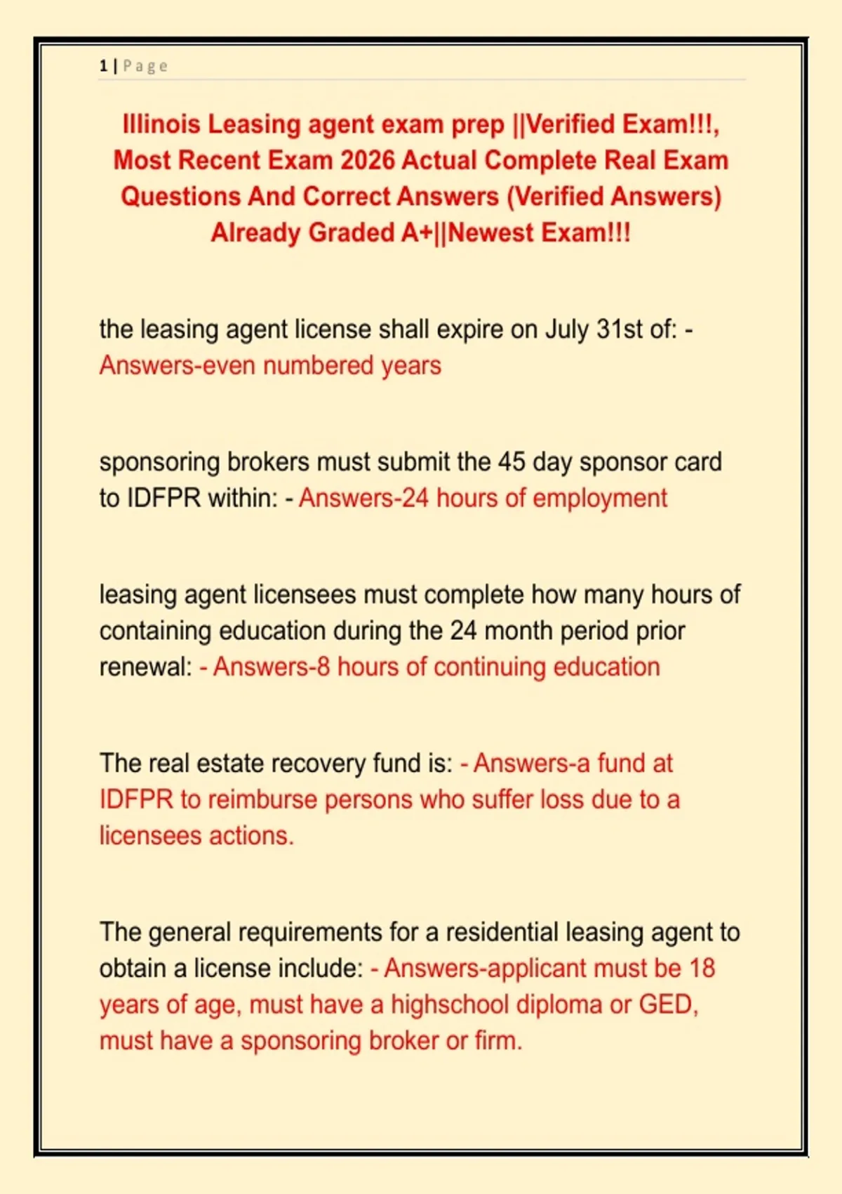 Illinois Leasing agent exam prep ||Verified Exam!!!, Most Recent Exam 2026 Actual Complete Real Exam Questions And Correct Answers (Verified Answers) Already Graded A+||Newest Exam!!!