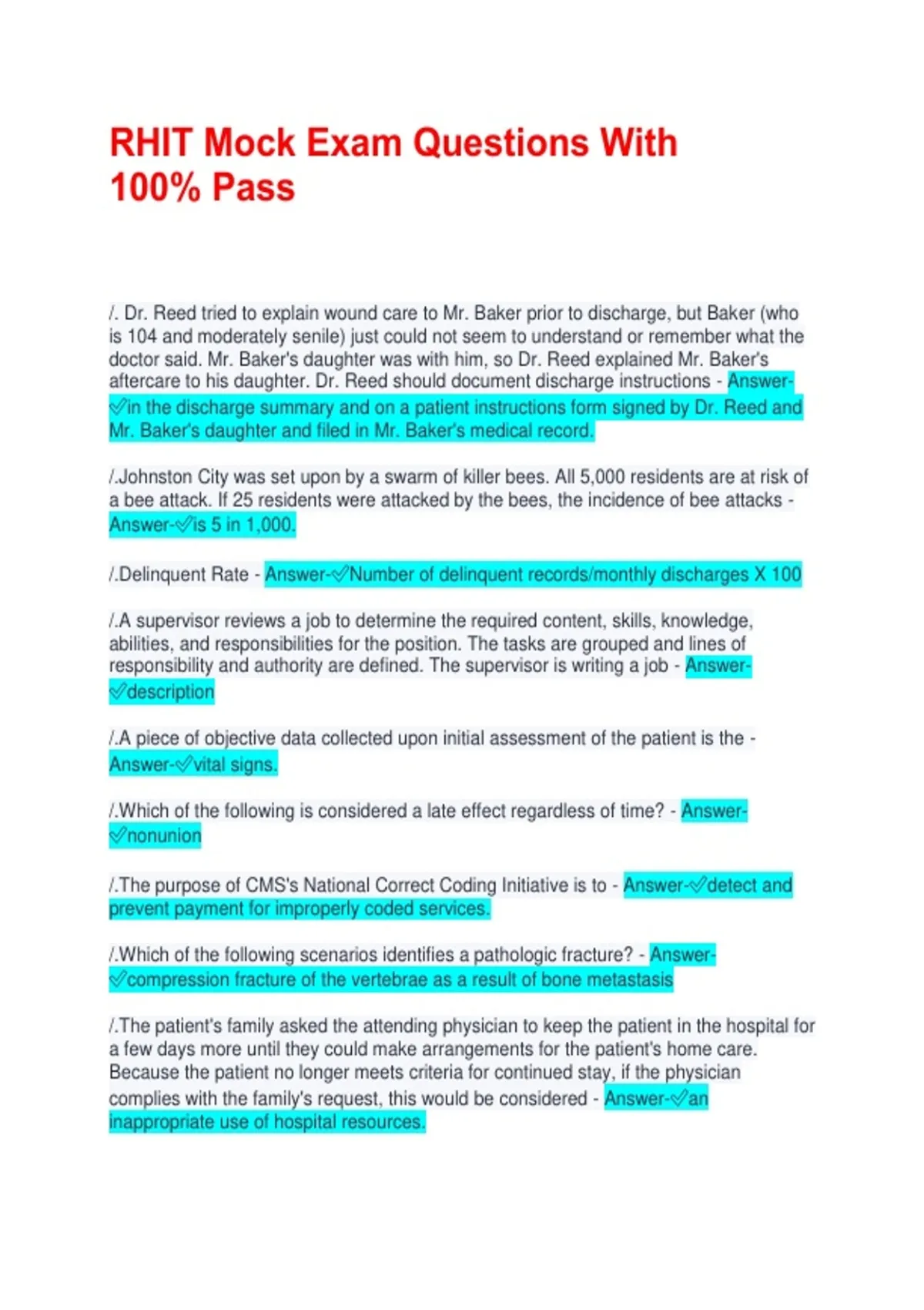 RHIT Mock Exam Questions With 100% Pass /. Dr. Reed tried to explain wound care to Mr. Baker prior to discharge, but Baker (who is 104 and moderately senile) just could not seem to understand or remember what the doctor said. Mr. Baker's daughter was with him, so Dr. Reed explained Mr. Baker's aftercare to his daughter. Dr. Reed should document discharge instructions - Answer-in the discharge summary and on a patient instructions form signed by Dr. Reed and Mr. Baker's daughter and filed in Mr. Baker's medical record. /.Johnston City was set upon by a swarm of killer bees. All 5,000 residents are at risk of a bee attack. If 25 residents were attacked by the bees, the incidence of bee attacks - Answer-is 5 in 1,000. /.Delinquent Rate - Answer-Number of delinquent records/monthly discharges X 100 /.A supervisor reviews a job to determine the required content, skills, knowledge, abilities, and responsibilities for the position. The tasks are grouped and lines of responsibility and authority are defined. The supervisor is writing a job - Answer-description /.A piece of objective data collected upon initial assessment of the patient is the - Answer-vital signs. /.Which of the following is considered a late effect regardless of time? - Answer-nonunion /.The purpose of CMS's National Correct Coding Initiative is to - Answer-detect and prevent payment for improperly coded services. /.Which of the following scenarios identifies a pathologic fracture? - Answer-compression fracture of the vertebrae as a result of bone metastasis /.The patient's family asked the attending physician to keep the patient in the hospital for a few days more until they could make arrangements for the patient's home care. Because the patient no longer meets criteria for continued stay, if the physician complies with the family's request, this would be considered - Answer-an inappropriate use of hospital resources. /.A pharmacist at your facility was caught running a drug ring. The pharmacist filled orders of valuable medications with cheap outdated ones purchased on the Internet and then sold the good drugs for profit. Patients have been injured, and the lawsuits are starting. Unfortunately, your facility is going to be held responsible for the pharmacist's negligent acts under the doctrine of - Answer-respondeat superior. /.Community Hospital Administration decided to change the number of adult and children beds from 300 to 375 effective on the first day in July. The total number of inpatient service days for adults and children for the year was 111,963. What was the percentage of occupancy rate for adults and children for the entire year? - Answer-90.8% (Total inpatient service days for a period/ total bed count days in a period X 100) /.You supervise five clerical employees who will be moving when a new wing of your facility is completed. When you meet with the architect to plan their space, you will ask for - Answer-300 square feet of space for your clerical staff. /.The difference between an Institutional Review Board (IRB) and a hospital's Ethics Committee is that - Answer-the IRB deals with the ethical treatment of human research subjects, and the Ethics Committee covers a wide range of issues. /.You have been asked to report the registry's annual caseload to administration. The most efficient way to retrieve this information would be to use - Answer-accession register. /.Incomplete abortion complicated by excessive hemorrhage; dilation and curettage performed. - Answer-O03.1, 10D17ZZ /.A 4-year-old child had a repair of an incarcerated inguinal hernia. This is the first time this child had been treated for this condition. - Answer-49501 /.A patient initially consulted with Dr. Vasseur at the request of Dr. Meche, the patient's primary care physician. Dr. Vasseur examined the patient, prescribed medication, and ordered tests. Additional visits to Dr. Vasseur's office for continuing care would be assigned from which E/M section? - Answer-office and other outpatient services, established patient /.You are the office manager at a large group practice. One of the physicians at your practice has asked you to research and supply her with information about Medicare's newest payment incentives and how to comply with the quality reporting requirements. You will bring this inquisitive physician facts from CMS regarding - Answer-Merit-based Incentive Payment System (MIPS) /.1=Strongly disagree 2=Disagree 3=No opinion 4=Agree 5=Strongly agree The data collected using this scale are commonly referred to as - Answer-ordinal data. /.A patient has written to request a copy of his own record. When the clerk checked the record, it was noted that the patient was last admitted to the psychiatric unit of the facility. You advise the clerk to - Answer-contact the patient's attending physician before complying. /.The census taken at midnight on January 1 showed 99 patients remaining in the hospital. On January 2, four patients were admitted, there was one fetal death, one DOA, and seven patients were discharged. One of these patients was admitted in the morning and remained only 8 hours. How many inpatient service days were rendered on January 2? - Answer-97 /.You are calculating the fee schedule payment amount for physician services covered under Medicare Part B. You already have the relative value unit figure. The system you are likely referencing is - Answer-RBRVS. /.In reviewing the policies on release of information in respect to the privacy rules, you note that it is still acceptable to allow release of protected health information without patient permission to quality review committees within the hospital. In this case, the PHI is being used as part of the facility's - Answer-health care operations. /.You are implementing a quality improvement plan that utilizes the PDSA cycle. If you correctly implement PDSA, which phase of the project will take the most of your time? - Answer-P /.Four patients were discharged from Crestview Hosp