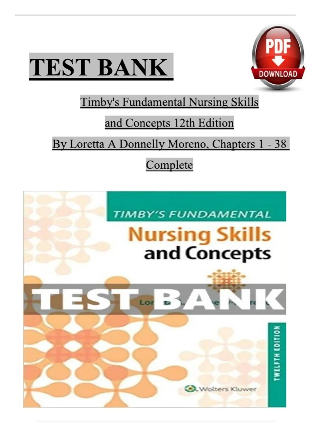 This Test Bank for Fundamental Nursing Skills and Concepts, 12th Edition by Barbara Kuhn Timby is a comprehensive academic resource covering all chapters of the textbook. It includes multiple-choice, true/false, and scenario-based questions with answers, designed to help nursing students reinforce knowledge, improve critical thinking, and excel in exams and clinical assessments. Topics covered include: Nursing process: assessment, planning, implementation, and evaluation Basic patient care skills and clinical procedures Safety, infection control, and standard precautions Vital signs, patient monitoring, and documentation Communication and therapeutic relationships Medication administration and dosage calculations Patient-centered care and cultural considerations Nursing interventions for various medical-surgical conditions Critical thinking and clinical decision-making skills This A+ graded test bank aligns perfectly with the 12th edition, making it an essential tool for exam preparation, NCLEX review, quizzes, and coursework. Each question is structured to reinforce comprehension, clinical reasoning, and practical application of fundamental nursing skills.