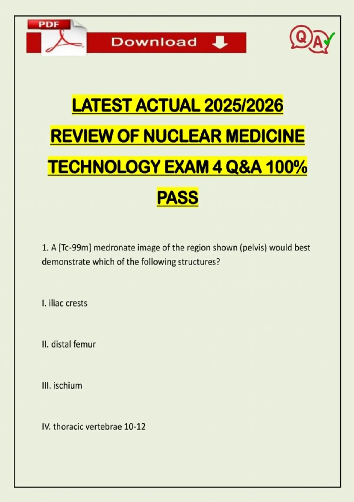 LATEST ACTUAL 2025/2026 REVIEW OF NUCLEAR MEDICINE TECHNOLOGY EXAM 4 Q&A 100% PASS 1. A [Tc-99m] medronate image of the region shown (pelvis) would best demonstrate which of the following structures? I. iliac crests II. distal femur III. ischium IV. thoracic vertebrae 10-12Need assistance on Online classes, Exams & Assignments? Reach out for instant help!! Full Course Assistance, Plagiarism-free Essay Writing, Research Paper, Dissertation, Discussion Posts, etc…. Confidential & Secure services. Tutors are available for all subjects! Email now at: - a. III and IV only - b. I and III only - c. III - d. I, III, and IV only - e. I, II, III, and IV - Answer -- Ans: - c. III