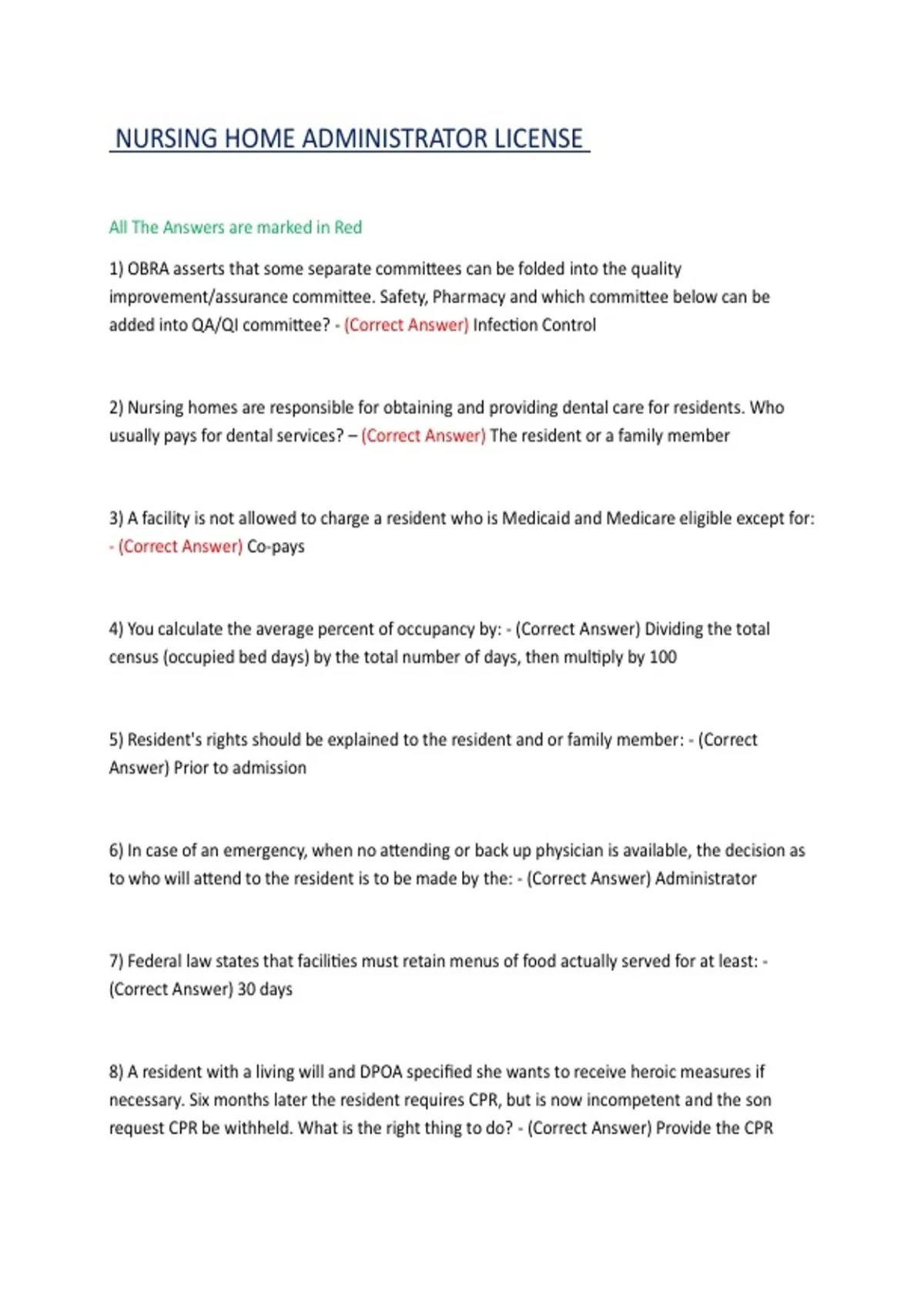 Nursing Home Administrator License Evaluation FREQUENTLY TESTED QUESTIONS WITH DETAILED ANSWERS | GUARANTEED PASS | GRADED A | LATEST UPDATE