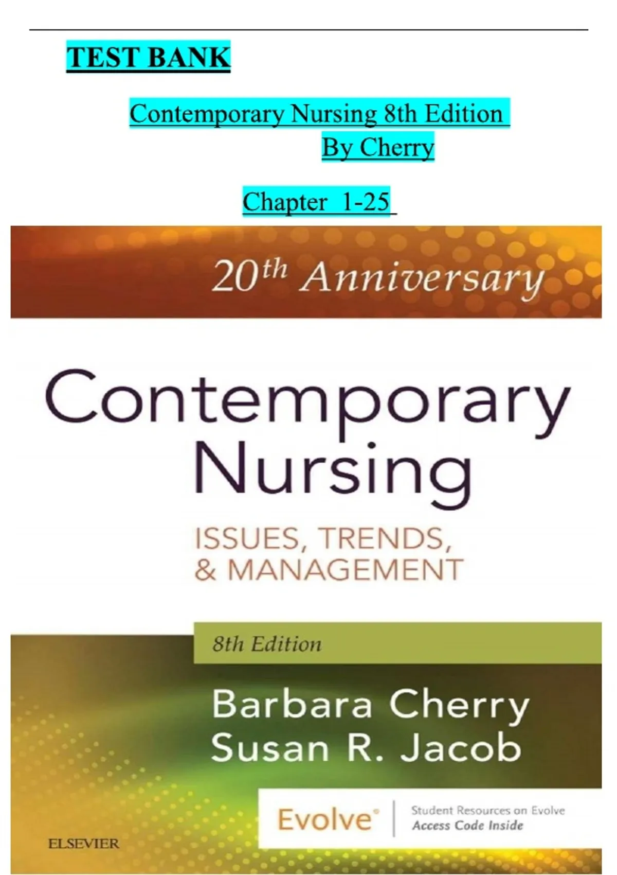 This Test Bank for Contemporary Nursing, 8th Edition by Sandra B. Cherry is a complete academic resource covering all chapters of the textbook. It provides multiple-choice, true/false, and scenario-based questions with verified answers, designed to help nursing students reinforce knowledge, strengthen critical thinking, and excel in exams and clinical practice. Topics covered include: Professional nursing roles and responsibilities Nursing theories and conceptual frameworks Patient-centered care and holistic nursing practice Nursing process: assessment, diagnosis, planning, implementation, and evaluation Evidence-based practice, quality improvement, and patient safety Communication, collaboration, and interprofessional teamwork Legal, ethical, and cultural considerations in nursing practice Leadership, management, and professional development in healthcare Community and public health nursing concepts Health promotion, disease prevention, and wellness strategies Critical thinking, clinical reasoning, and decision-making in nursing This A+ graded test bank aligns perfectly with the 8th edition, making it an essential study tool for exam preparation, NCLEX review, quizzes, and coursework. Each question is carefully structured to reinforce comprehension, clinical reasoning, and application of contemporary nursing principles in real-world settings.