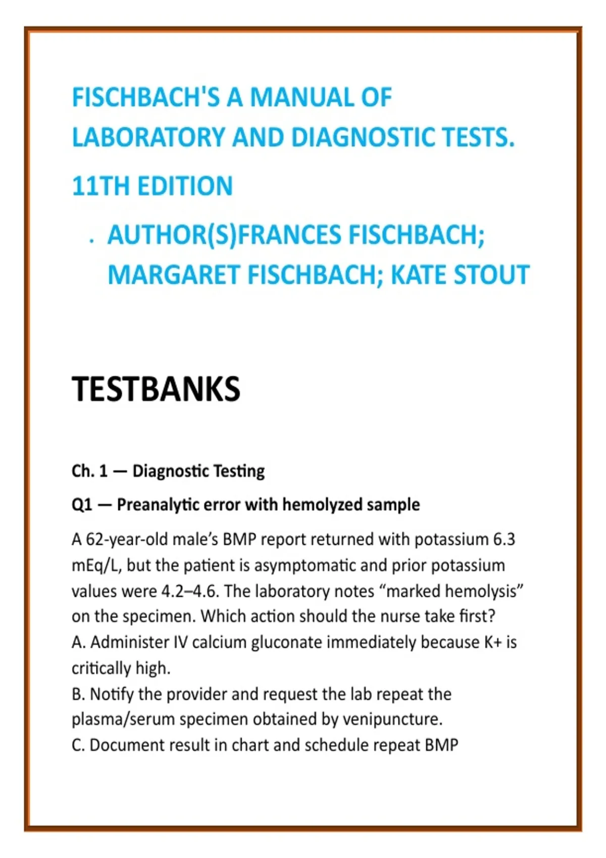 Fischbach Laboratory Test Bank Nursing Test Bank 2026 | Laboratory & Diagnostic Tests Nursing MCQs + Lab Values Review 2) SEO Product Description (200–300 words) Master laboratory and diagnostic test interpretation with confidence using this comprehensive nursing test bank based on Fischbach’s A Manual of Laboratory and Diagnostic Tests, 11th Edition—the gold-standard reference for nursing and clinical diagnostics education. This nursing test bank 2026 delivers full textbook coverage across ALL chapters and units, with 20 clinically focused multiple-choice questions (MCQs) per chapter, written to reflect real-world diagnostic decision-making and NCLEX-style application. Every question emphasizes interpretation of laboratory values, diagnostic procedures, specimen collection, patient preparation, and result analysis, ensuring learners move beyond memorization to true clinical reasoning. Each MCQ includes clear correct answers and concise, evidence-based rationales aligned directly with Fischbach’s interpretations and terminology. Scenarios integrate abnormal findings, safety considerations, pre-analytic and post-analytic responsibilities, and urgent clinical implications—helping students reduce diagnostic errors and strengthen patient care outcomes. Ideal for students enrolled in: Laboratory & Diagnostic Tests in Nursing Health Assessment & Diagnostics Clinical Nursing Practice Medical-Surgical Nursing (diagnostic components) Practical Nursing (PN/LPN) programs Associate Degree Nursing (ADN) programs BSN programs emphasizing diagnostics and patient monitoring Key Features: FULL chapter-by-chapter coverage of Fischbach’s 11th Edition 20 laboratory & diagnostic-focused MCQs per chapter Accurate lab value interpretation with clinical correlation Patient preparation, specimen handling, and safety emphasis Designed for exams, clinical readiness, and diagnostic mastery This diagnostic test interpretation study guide is a time-efficient, high-yield resource for nursing students who want to improve lab interpretation accuracy, boost exam confidence, and excel in clinical practice. 3) 8 High-Value SEO Keywords Fischbach laboratory test bank laboratory and diagnostic tests nursing MCQs nursing diagnostic tests MCQs Fischbach lab values review diagnostic test interpretation study guide laboratory values nursing study guide nursing test bank 2026 clinical diagnostics nursing exam questions 4) 10 Optimized Hashtags #FischbachTestBank #NursingDiagnostics #LaboratoryTestsNursing #DiagnosticInterpretation #NursingMCQs #LabValuesReview #ClinicalNursingStudy #NursingTestBank2026 #MedicalSurgicalNursing #ADNBSNStudy