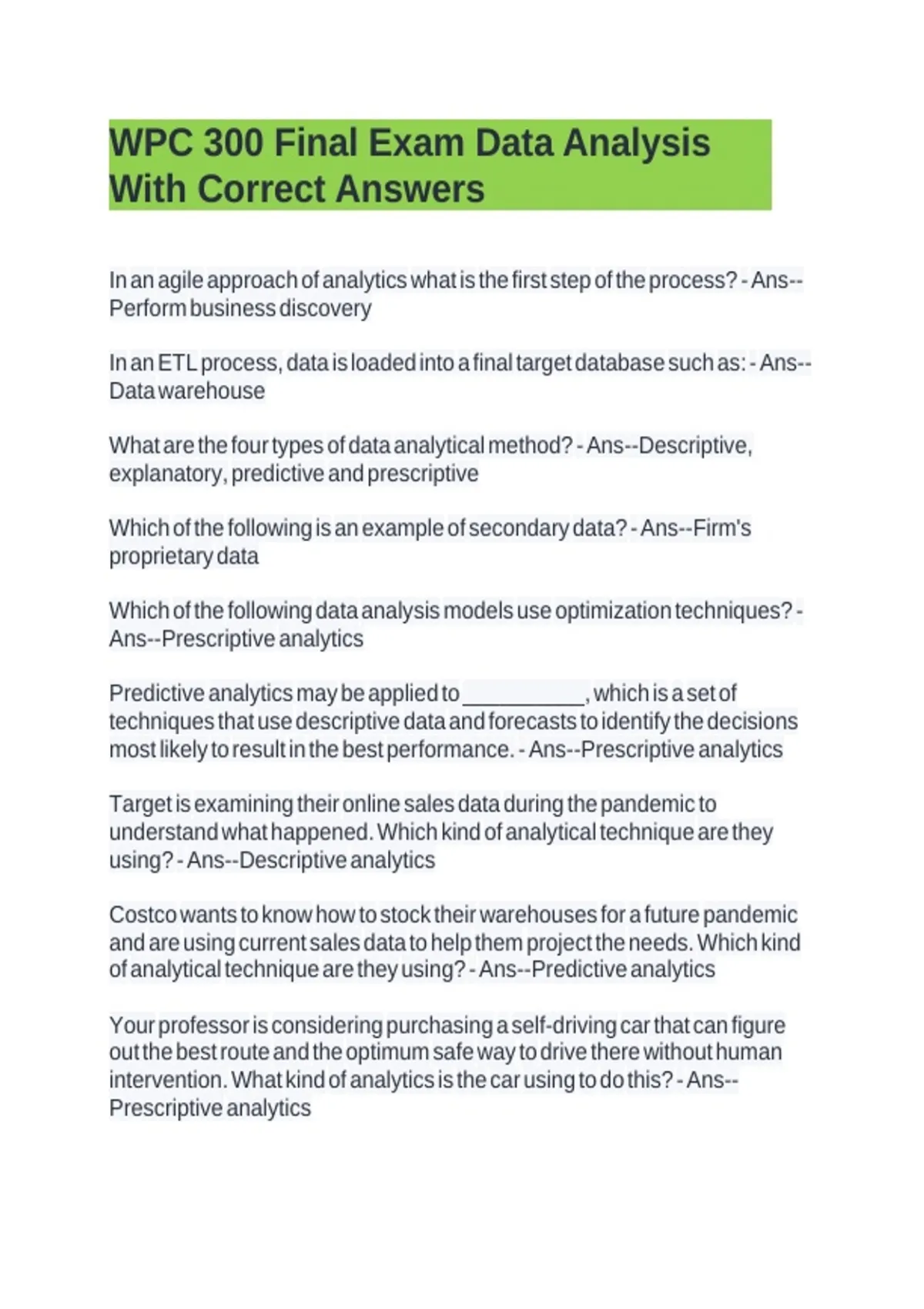 WPC 300 Final Exam Data Analysis With Correct Answers