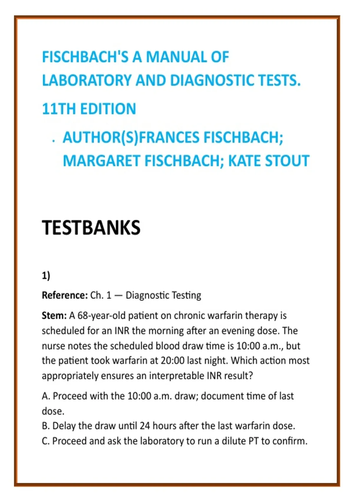 Fischbach Laboratory Test Bank | Nursing Test Bank 2026 | Laboratory & Diagnostic Tests Nursing MCQs + Lab Values Review 2) SEO Product Description (200–300 words) Master laboratory and diagnostic test interpretation with confidence using this comprehensive Nursing Test Bank 2026 based on Fischbach’s A Manual of Laboratory and Diagnostic Tests, 11th Edition—the gold-standard reference for nursing and clinical diagnostics education. This digital Fischbach laboratory test bank delivers full textbook coverage across all chapters, with 20 high-quality, clinically focused MCQs per chapter designed to strengthen diagnostic reasoning, reduce interpretation errors, and prepare students for real-world clinical decision-making. Each question mirrors nursing-school exams and NCLEX-style clinical judgment, emphasizing abnormal findings, critical values, patient preparation, specimen collection, and post-test nursing responsibilities. Every item includes concise, evidence-based rationales that clearly explain the clinical significance of results and link laboratory data to underlying pathophysiology. Scenarios require application and analysis—not memorization—making this resource ideal for both exam preparation and bedside readiness. What You’ll Gain Accurate interpretation of laboratory values and diagnostic tests Stronger clinical judgment and safer patient care decisions Faster, more efficient exam preparation Increased confidence in diagnostics-focused nursing courses Ideal For Laboratory & Diagnostic Tests in Nursing Health Assessment & Diagnostics Clinical Nursing Practice Medical-Surgical Nursing (diagnostic components) PN/LPN, ADN, and BSN programs Key Features FULL coverage of Fischbach’s Manual (11th Edition) 20 diagnostic-focused MCQs per chapter NCLEX-style clinical interpretation scenarios Verified rationales aligned with nursing practice 100% digital, instant access, exam-ready format Designed for nursing students who want accuracy, clarity, and clinical excellence in laboratory diagnostics. 3) 8 High-Value SEO Keywords Fischbach laboratory test bank laboratory and diagnostic tests nursing MCQs nursing diagnostic tests MCQs Fischbach lab values review diagnostic test interpretation study guide nursing laboratory values test bank clinical diagnostics nursing exam questions laboratory diagnostics nursing test bank 4) 10 Hashtags #FischbachTestBank #NursingDiagnostics #LaboratoryValuesNursing #DiagnosticTestsNursing #NCLEXLabValues #NursingMCQs #ClinicalLabInterpretation #NursingExamPrep #LabDiagnosticsTestBank #NursingStudyResources