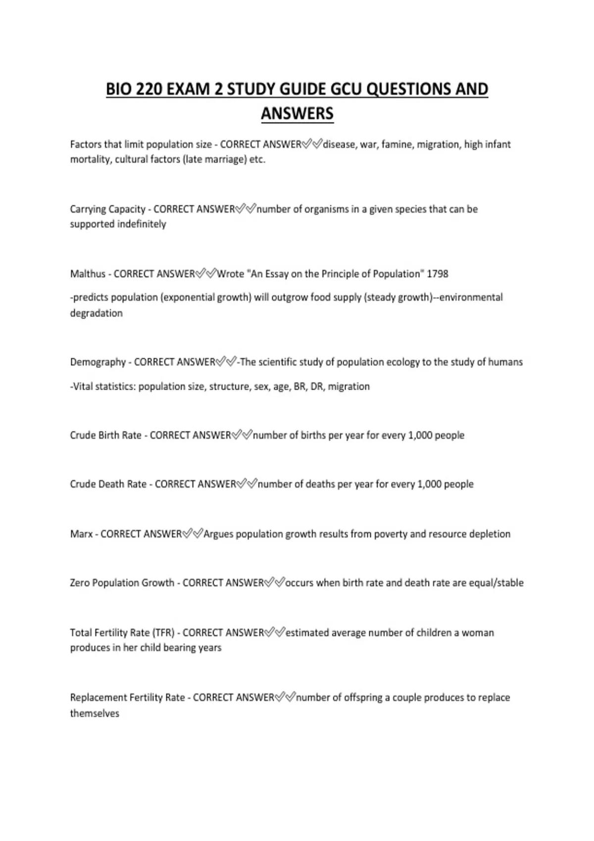 BIO 220 EXAM 2 STUDY GUIDE GCU QUESTIONS AND ANSWERS Factors that limit population size - CORRECT ANSWERdisease, war, famine, migration, high infant mortality, cultural factors (late marriage) etc.