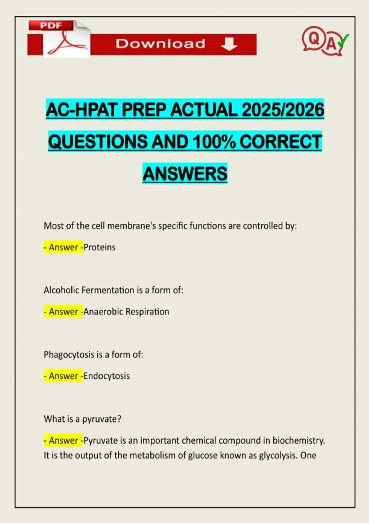 AC-HPAT PREP ACTUAL 2025/2026 QUESTIONS AND 100% CORRECT ANSWERS Most of the cell membrane's specific functions are controlled by: - Answer -Proteins Alcoholic Fermentation is a form of: - Answer -Anaerobic Respiration Phagocytosis is a form of: - Answer -Endocytosis What is a pyruvate? - Answer -Pyruvate is an important chemical compound in biochemistry. It is the output of the metabolism