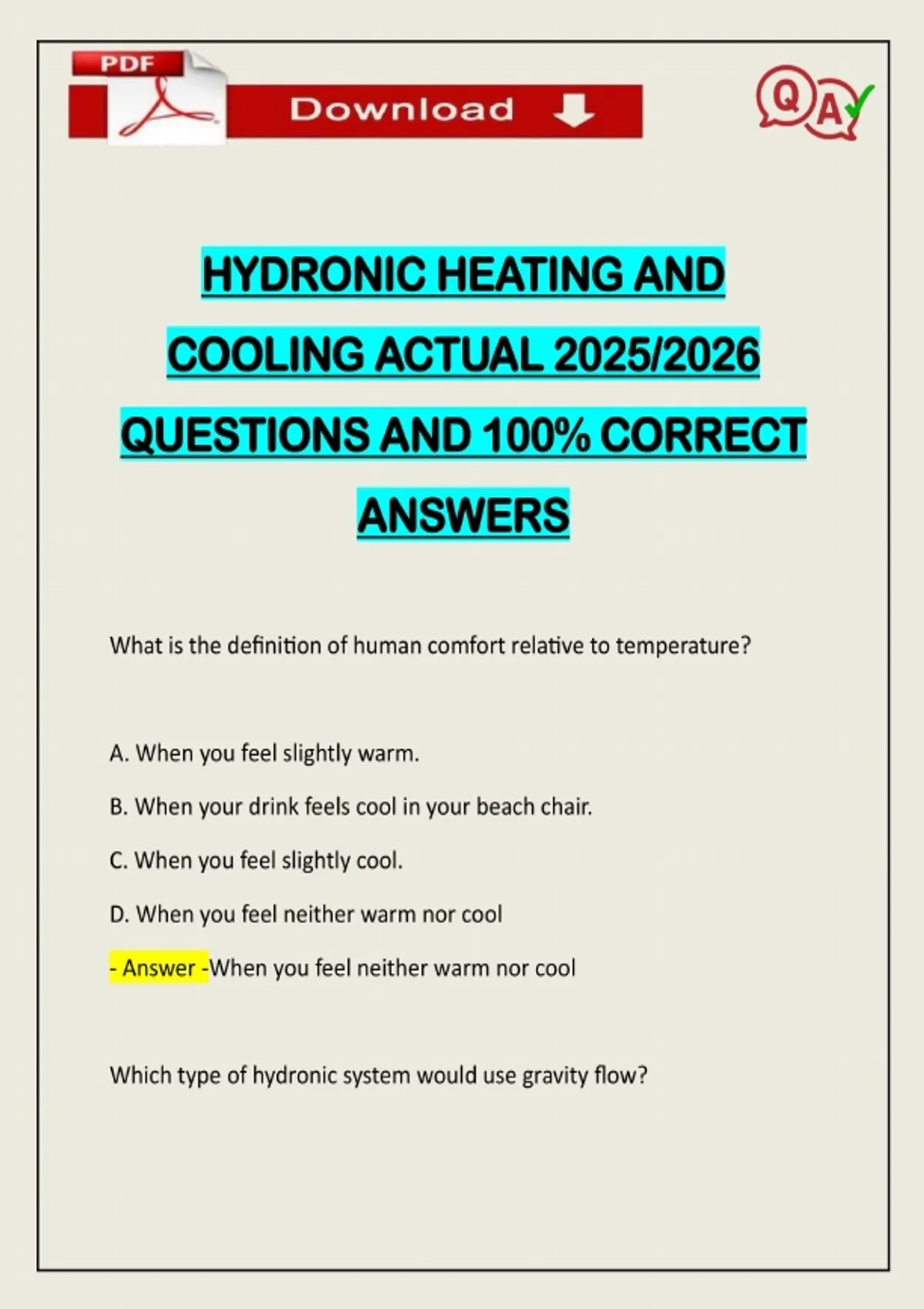 HYDRONIC HEATING AND COOLING ACTUAL 2025/2026 QUESTIONS AND 100% CORRECT ANSWERS What is the definition of human comfort relative to temperature? A. When you feel slightly warm. B. When your drink feels cool in your beach chair. C. When you feel slightly cool. D. When you feel neither warm nor cool - Answer -When you feel neither warm nor cool Which type of hydronic system