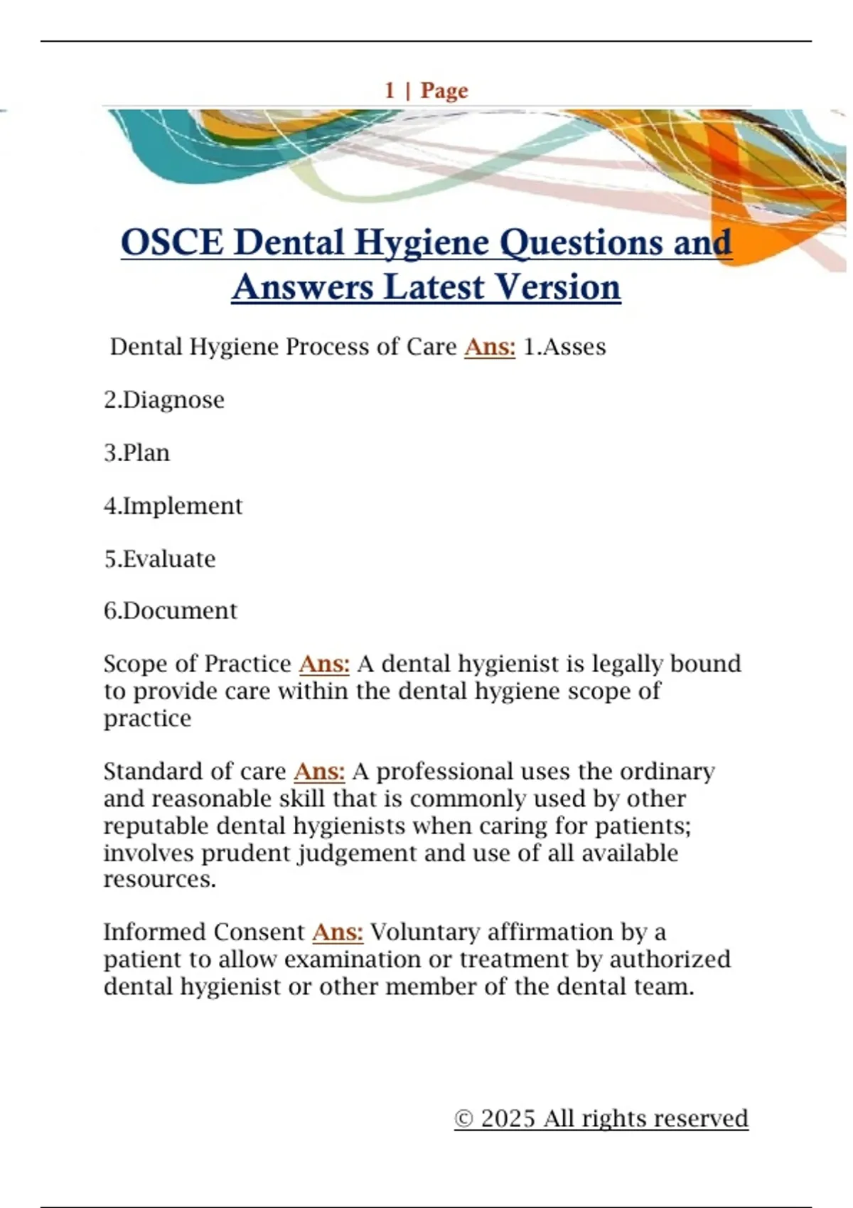 OSCE Dental Hygiene Questions and Answers Latest Version