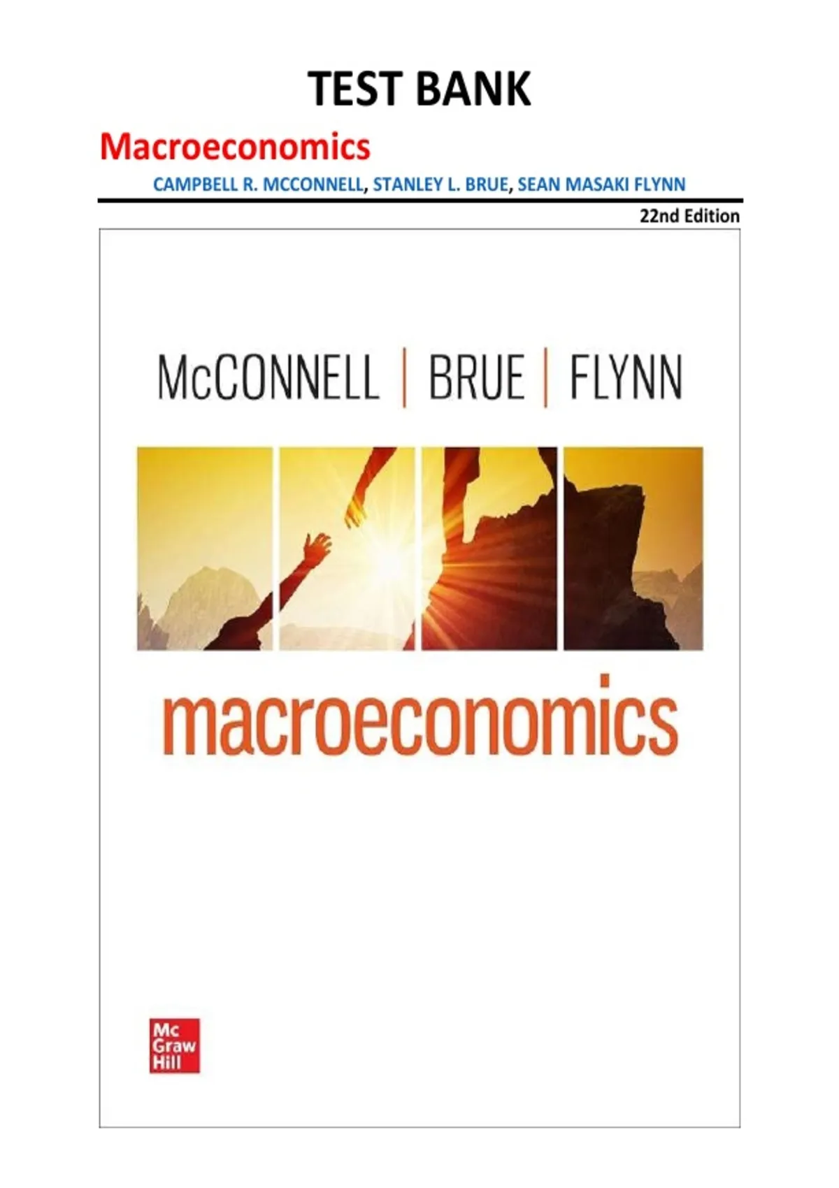 The Macroeconomics 22nd Edition Test Bank by Campbell R. McConnell, Stanley L. Brue, and Sean Masaki Flynn provides comprehensive exam-style questions with verified correct answers covering core macroeconomic principles. Topics include GDP, economic growth, inflation, unemployment, fiscal and monetary policy, aggregate demand and supply, international trade, and economic stabilization. Designed for students and instructors, this test bank supports exam preparation, homework success, and deep understanding of modern macroeconomic theory and policy applications.