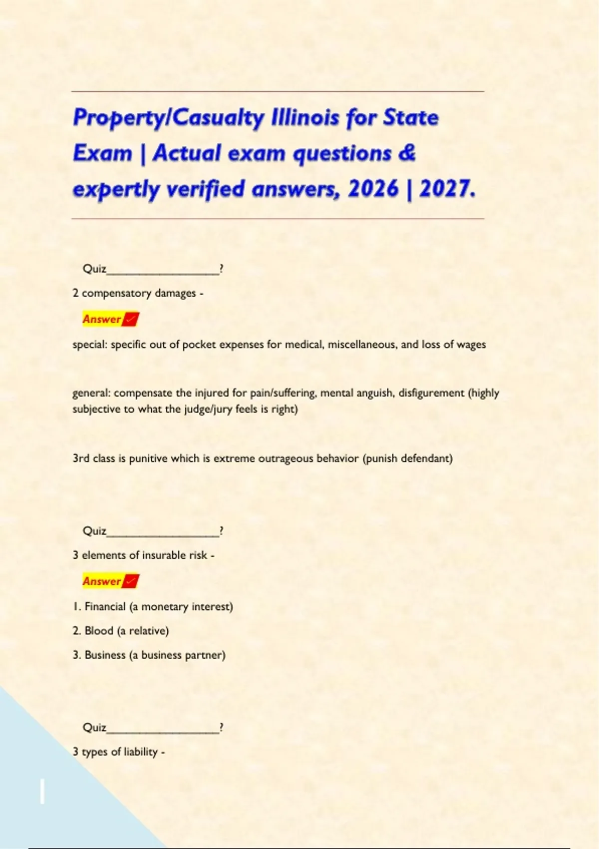 Property/Casualty Illinois for State Exam | Actual exam questions & expertly verified answers, 2026 | 2027. Quiz_________________? 2 compensatory damages - Answer special: specific out of pocket expenses for medical, miscellaneous, and loss of wages general: compensate the injured for pain/suffering, mental anguish, disfigurement (highly subjective to what the judge/jury feels is right) 3rd class is punitive which is extreme outrageous behavior (punish defendant) Quiz_________________? 3 elements of insurable risk - Answer 1. Financial (a monetary interest) 2. Blood (a relative) 3. Business (a business partner) Quiz_________________? 3 types of liability - Answer 1. Absolute - if you aren't protecting others from it (absolutely something will go wrong; swiming pool) 2. Strict - deals with product liability; manufacturers/sellers of a product makes an implied warranty that a product is safe; business is liable for defective products 3. Vicarious- responsible for others' actions; transfer liability to someone with a greater ability to pay (dog unleashed; children throw party) Quiz_________________? 4 elements of a contract - Answer 1. Agreement (offer and acceptance; offer when application is submitted, acceptance when underwriter approves application and issues policy) 2. Consideration (something of value each party gives; insured = payment of premiums and representations/insurer = promise to pay in a loss) 3. Competent parties (legal age, not inebriated, mentally competent) 4. Legality (lawful reason, not against public policy) Quiz_________________? 7 coverage parts of CPP - Answer 1. General liability (covers you from being sued by others) 2. Commercial property (direct and indirect coverages) 3. Inland Marine ("coast to coast; land, air, entry waterways") 4. Commercial Auto 5. Equipment Breakdown 6. Crime (not employee theft) Quiz_________________? Accident vs. Occurrence - Answer an accident is a sudden, unplanned and unexpected event not under the control of the insured and results in injury/damage that is not intended/expected an occurrence includes losses caused by continuous or repeated exposure to conditions resulting in injury to persons or damage to property that is neither intended nor expected Quiz_________________? actual cash value - Answer recognizes the reduction of value of property as it ages and becomes subject to wear and tear and obsolescence calculated by: (current replacement cost) - (depreciation) Quiz_________________? additional coverages for BPP - Answer debris removal, preservation of property, fire department service charge, pollutant cleanup, increased cost of construction, electronic data Quiz_________________? additional insured - Answer Individuals or business that are not named as insured on the declaration page, but are protected by the policy, usually in regard to a specific interest Quiz_________________? after 5 years, personal auto/property policy are.... - Answer NO LONGER GROUNDS FOR CANCELLATION Quiz_________________? aggregate limit - Answer maximum amount an insurer will pay for all covered losses during the covered policy period