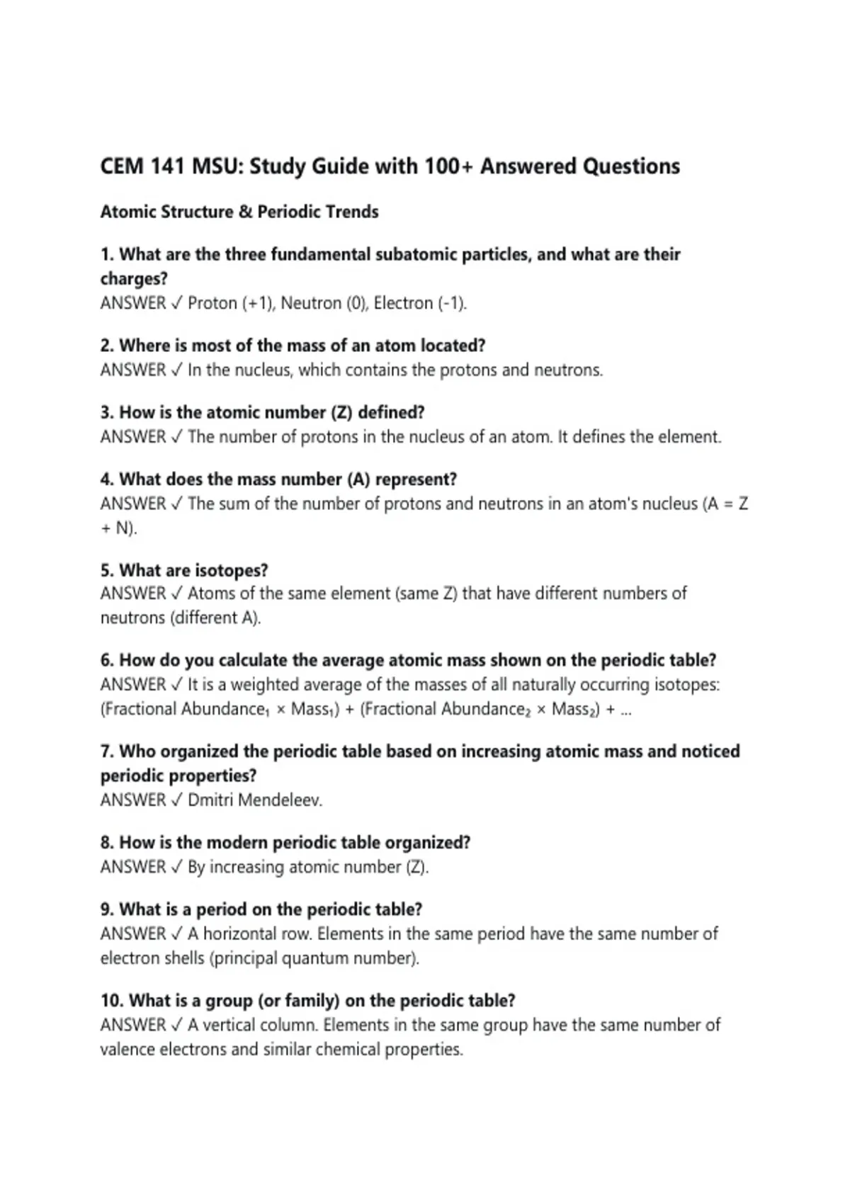 CEM 141 MSU: Study Guide with 100+ Answered Questions Atomic Structure & Periodic Trends 1. What are the three fundamental subatomic particles, and what are their charges? ANSWER Proton (+1), Neutron (0), Electron (-1). 2. Where is most of the mass of an atom located? ANSWER In the nucleus, which contains the protons and neutrons. 3. How is the atomic number (Z) defined? ANSWER The number of protons in the nucleus of an atom. It defines the element. 4. What does the mass number (A) represent? ANSWER The sum of the number of protons and neutrons in an atom's nucleus (A = Z + N). 5. What are isotopes? ANSWER Atoms of the same element (same Z) that have different numbers of neutrons (different A). 6. How do you calculate the average atomic mass shown on the periodic table? ANSWER It is a weighted average of the masses of all naturally occurring isotopes: (Fractional Abundance₁ × Mass₁) + (Fractional Abundance₂ × Mass₂) + ... 7. Who organized the periodic table based on increasing atomic mass and noticed periodic properties? ANSWER Dmitri Mendeleev. 8. How is the modern periodic table organized? ANSWER By increasing atomic number (Z). 9. What is a period on the periodic table? ANSWER A horizontal row. Elements in the same period have the same number of electron shells (principal quantum number). 10. What is a group (or family) on the periodic table? ANSWER A vertical column. Elements in the same group have the same number of valence electrons and similar chemical properties. 11. What are the main group elements? ANSWER Elements in Groups 1, 2, and 13-18 (the s- and p-blocks). 12. What is the trend for atomic radius across a period (left to right)? ANSWER Atomic radius decreases. Increased effective nuclear charge pulls electrons closer. 13. What is the trend for atomic radius down a group? ANSWER Atomic radius increases. Electrons occupy higher principal energy levels (larger electron shells). 14. What is ionization energy? ANSWER The energy required to remove one electron from a gaseous atom or ion. 15. What is the trend for first ionization energy across a period (left to right)? ANSWER Ionization energy generally increases. Higher effective nuclear charge makes electrons harder to remove. 16. What is the trend for first ionization energy down a group? ANSWER Ionization energy decreases. The outermost electron is farther from the nucleus and shielded by inner shells