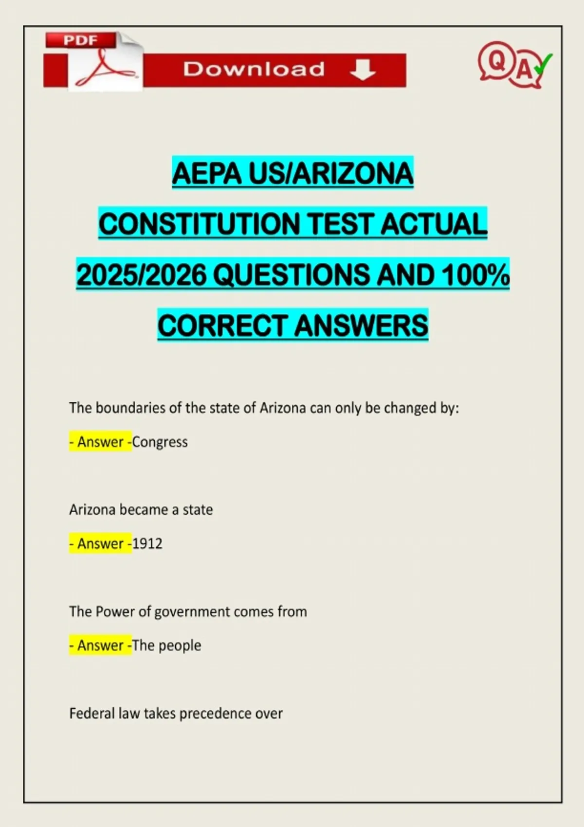 AEPA US/ARIZONA CONSTITUTION TEST ACTUAL 2025/2026 QUESTIONS AND 100% CORRECT ANSWERS The boundaries of the state of Arizona can only be changed by: - Answer -Congress Arizona became a state - Answer -1912 The Power of government comes from - Answer -The peop