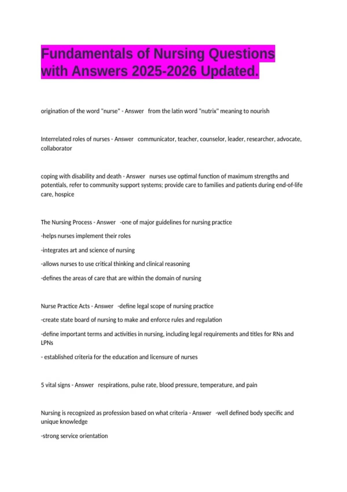 Nursing is recognized as profession based on what criteria - Answer -well defined body specific and