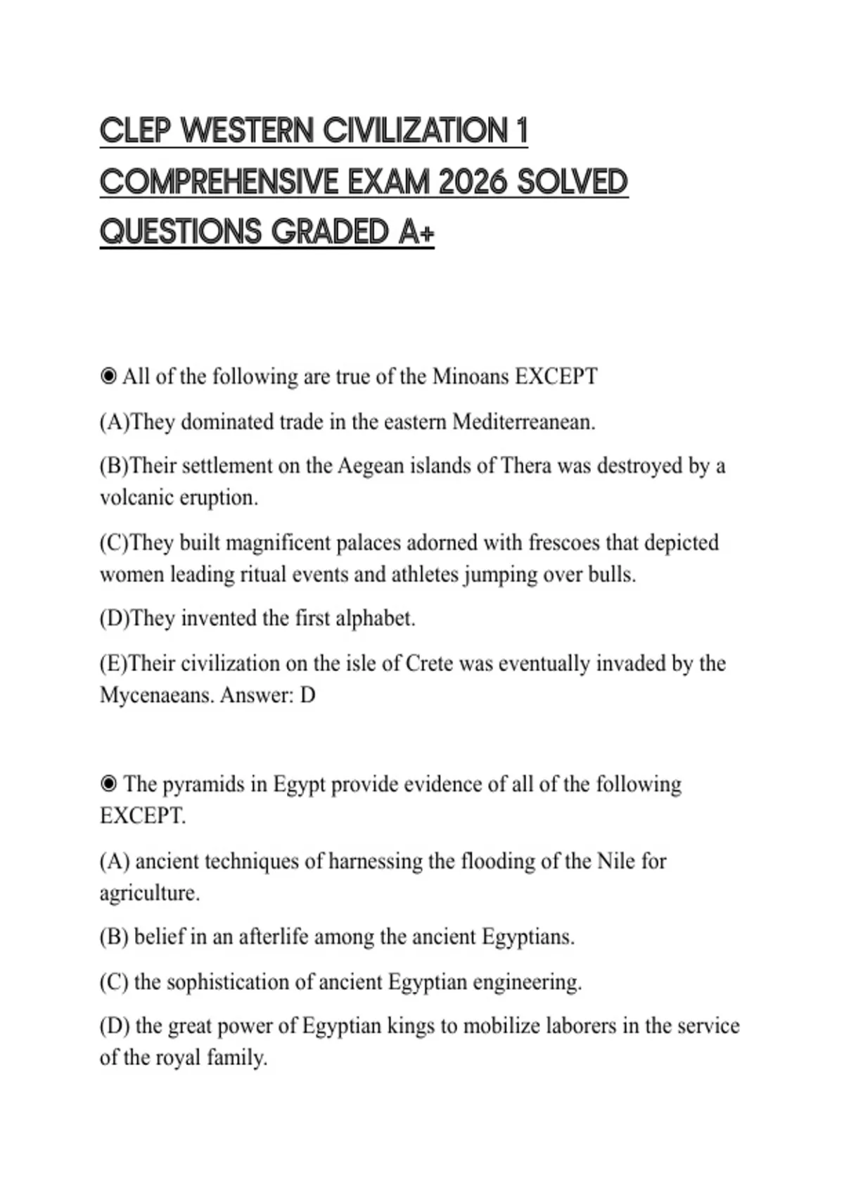 CLEP WESTERN CIVILIZATION 1 COMPREHENSIVE EXAM 2026 SOLVED QUESTIONS GRADED A+