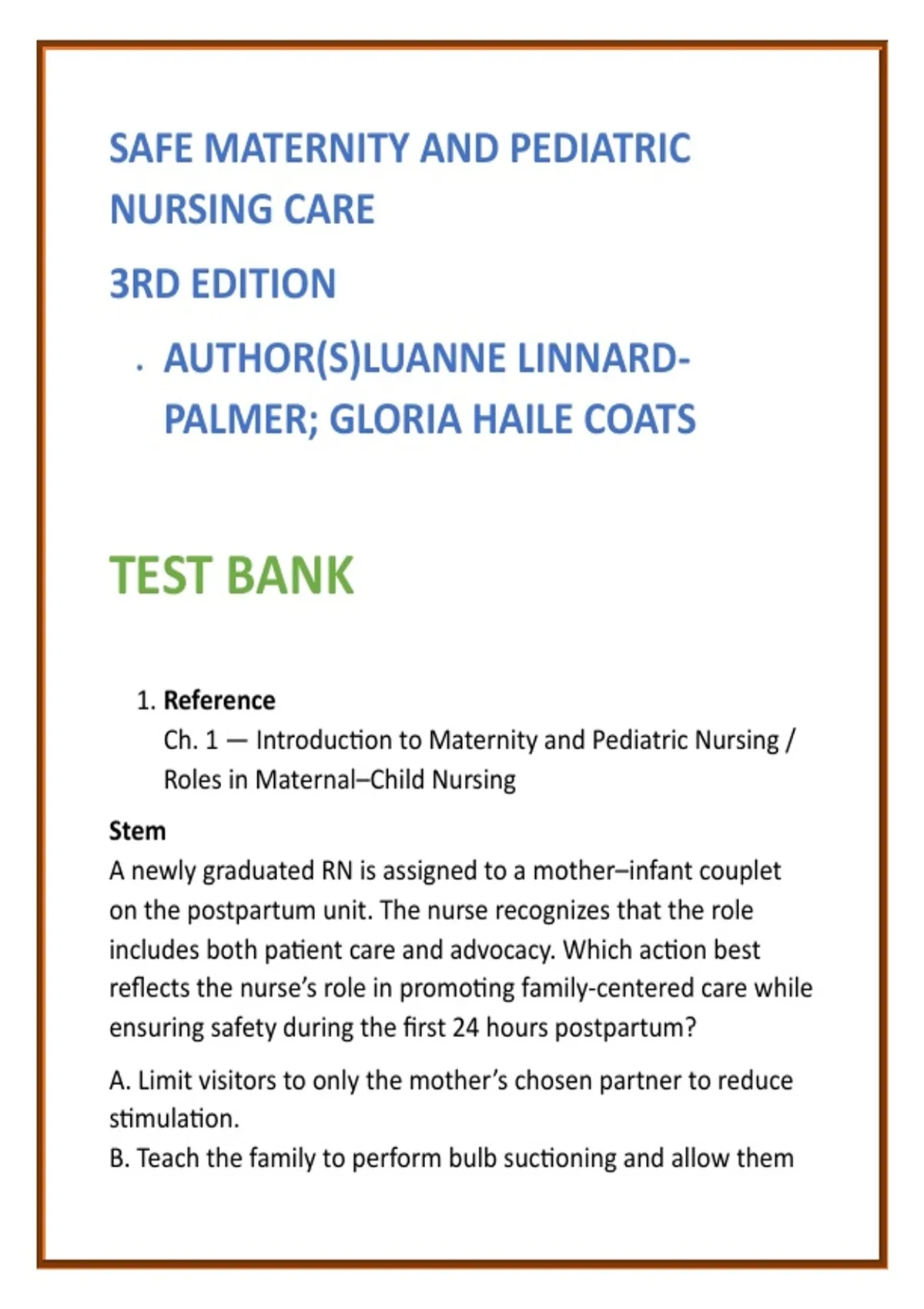 Safe Maternity & Pediatric Nursing Test Bank 2026 | Linnard-Palmer & Coats Nursing Test Bank | Maternal-Child NCLEX MCQs 2️⃣ SEO Product Description (200–300 words) Master maternity and pediatric nursing with confidence using the Safe Maternity and Pediatric Nursing Care, 3rd Edition Test Bank by Luanne Linnard-Palmer and Gloria Haile Coats—a comprehensive, exam-focused resource designed for today’s nursing students and NCLEX-RN® preparation in 2026. This nursing test bank provides full textbook coverage of ALL units and chapters, delivering 20 high-quality, NCLEX-style multiple-choice questions (MCQs) per chapter, each paired with accurate answers and concise, evidence-based rationales. Every question emphasizes clinical judgment, patient safety, risk reduction, developmental appropriateness, and family-centered care, reflecting real-world maternal and pediatric nursing practice. Built specifically for maternity nursing, pediatric nursing, and maternal-child health courses, this test bank helps learners move beyond memorization to prioritization, early recognition of complications, and safe nursing interventions—core skills tested on exams and required in clinical settings. What’s Included FULL coverage of Safe Maternity and Pediatric Nursing Care (3rd Edition) 20 NCLEX-style MCQs per chapter Detailed, evidence-based rationales for every question Scenarios covering pregnancy, labor, postpartum, neonates, infants, and children Focus on patient safety, clinical reasoning, and nursing decision-making Whether you’re preparing for unit exams, finals, or NCLEX-RN with a maternal-child focus, this Linnard-Palmer & Coats nursing test bank is a trusted, time-saving study tool that builds confidence and improves exam performance. 3️⃣ 8 High-Value SEO Keywords Safe Maternity and Pediatric Nursing test bank nursing test bank 2026 Linnard-Palmer Coats nursing study guide maternal-child NCLEX questions pediatric nursing MCQs maternity nursing test bank maternal child nursing exam questions NCLEX maternity pediatric review 4️⃣ 10 Optimized Hashtags #NursingTestBank #MaternalChildNursing #PediatricNursingMCQs #MaternityNursing #NCLEXPrep2026 #NursingStudents #NursingSchoolSuccess #MaternalChildNCLEX #NursingStudyGuide #ClinicalNursingEducation