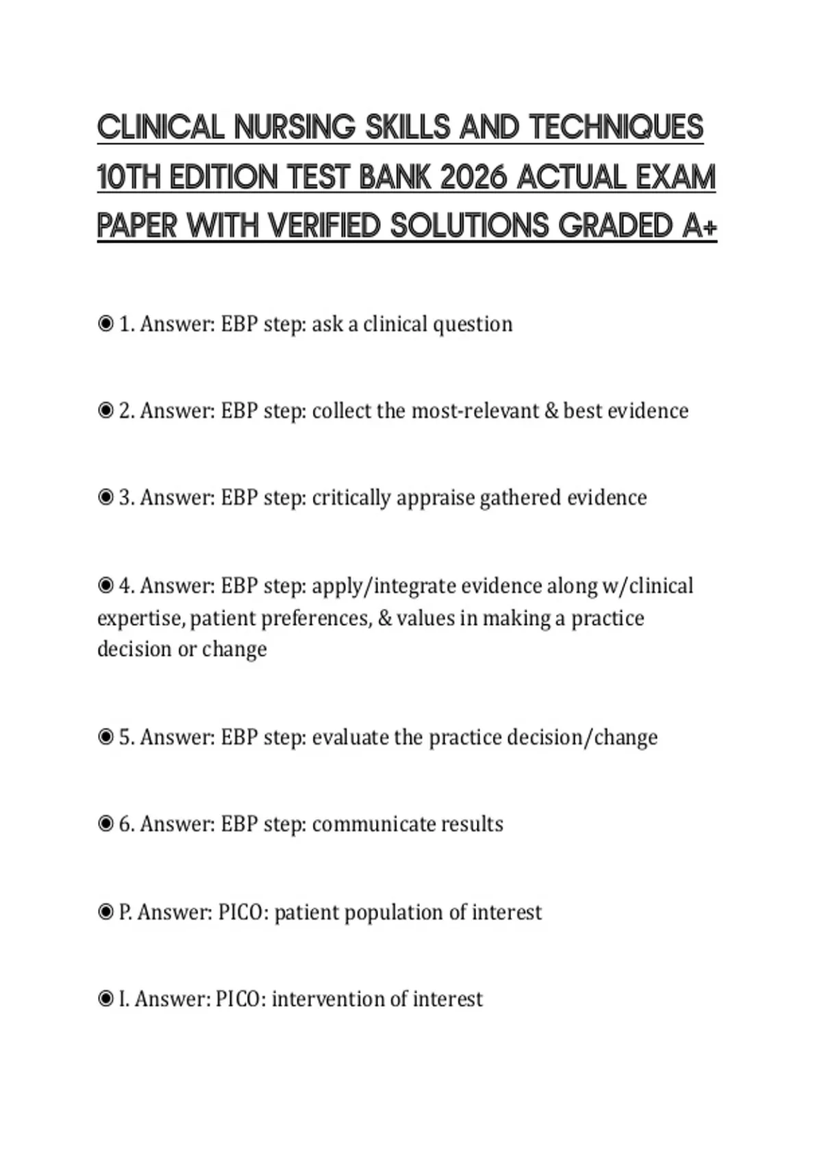 CLINICAL NURSING SKILLS AND TECHNIQUES 10TH EDITION TEST BANK 2026 ACTUAL EXAM PAPER WITH VERIFIED SOLUTIONS GRADED A+