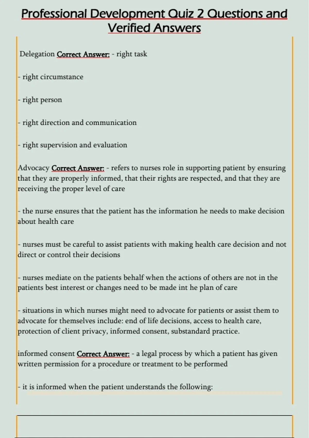 Advocacy Correct Answer: - refers to nurses role in supporting patient by ensuring