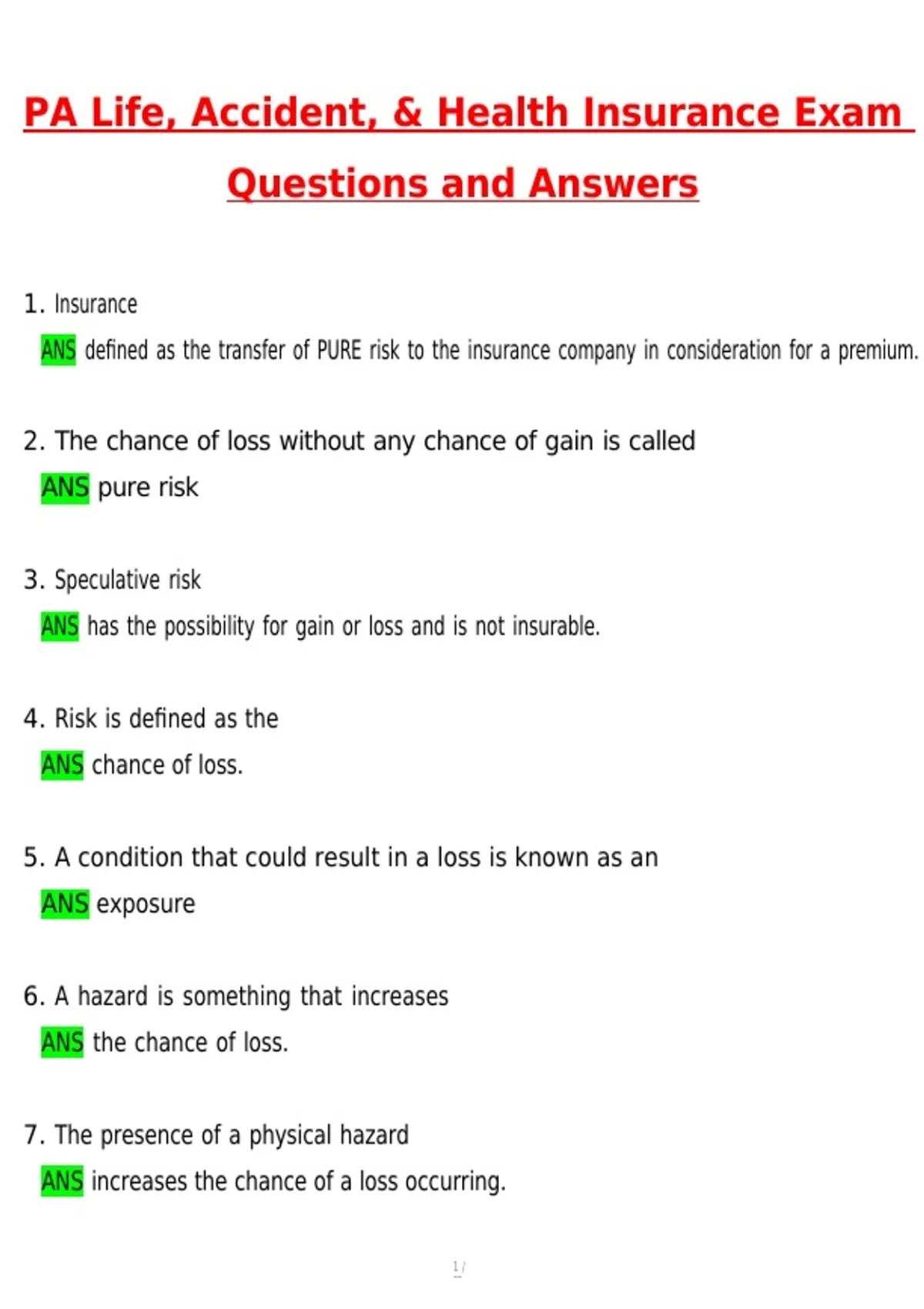 ANS defined as the transfer of PURE risk to the insurance company in consideration for a premium.