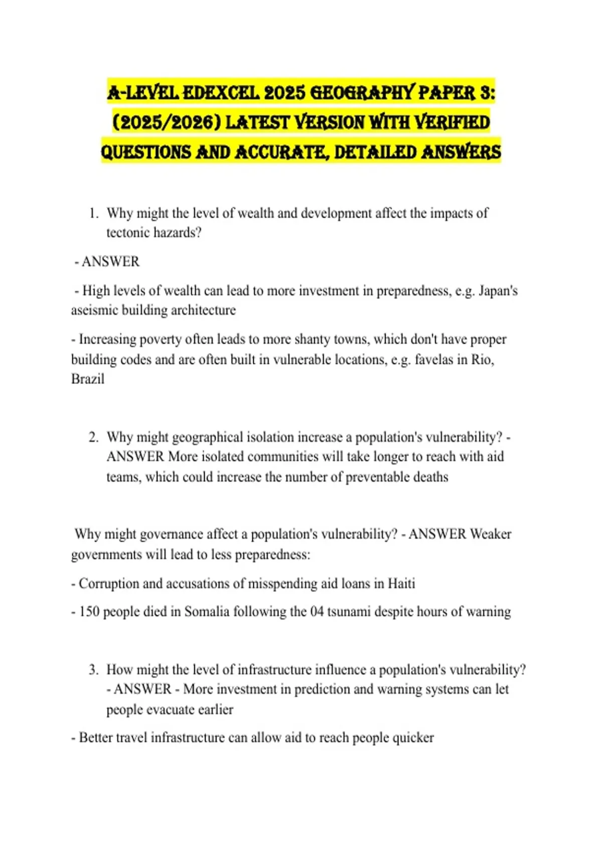 A-Level EDEXCEL 2025 Geography Paper 3: (2025/2026) LATEST VERSION WITH VERIFIED QUESTIONS AND ACCURATE, DETAILED ANSWERS 1. Why might the level of wealth and development affect the impacts of tectonic hazards? - ANSWER - High levels of wealth can lead to more investment in preparedness, e.g. Japan's aseismic building architecture - Increasing poverty often leads to more shanty towns, which don't have proper building codes and are often built in vulnerable locations, e.g. favelas in Rio, Brazil 2. Why might geographical isolation increase a population's vulnerability? - ANSWER More isolated communities will take longer to reach with aid teams, which could increase the number of preventable deaths Why might governance affect a population's vulnerability? - ANSWER Weaker governments will lead to less preparedness: - Corruption and accusations of misspending aid loans in Haiti - 150 people died in Somalia following the 04 tsunami despite hours of warning 3. How might the level of infrastructure influence a population's vulnerability? - ANSWER - More investment in prediction and warning systems can let people evacuate earlier - Better travel infrastructure can allow aid to reach people quicker 4. How can the level of education in a population affect its vulnerability? - ANSWER - More education about the risks of tectonic hazards can lead to effective measures to protect life, such as Earthquake preparation day in Japan 5. What were the impacts of the Pinatubo eruption? - ANSWER More than 800 died, 1.2 million left homeless, $700 million in economic damage, 15-20 million tonnes of SO2 caused global cooling of 0.6 degrees Celsius and farmland was destroyed, making 650,000 lose their jobs. 6. What physical factors increased the severity of the Pinatubo eruption? - ANSWER It was a VEI 6 eruption, many settlements are built in coastal lowlands, increasing the risk of lahars, or on the steep mountainsides, increasing the risk of pyroclastic flows and tephra. Also, Typhoon Yunya had just struck, which people had not recovered from, and provided water for lahars. 7. What human factors increased the risk of the Pinatubo eruption? - ANSWER Many settlements have a high population density due to rapid urbanisation, so 25% of the population lived in poverty in sub-par housing that would collapse under ash. Also, the Aeta tribe that lived near the volcano refused to evacuate, increasing the death toll. 8. When and where did the Eyjafjallajökull eruption occur? - ANSWER 2010, on the Mid Atlantic Ridge, at a VEI 4 eruption What were the impacts of the Eyjafjallajökull eruption? - ANSWER Airlines lost $1.7 billion due to grounded flights, and over 10 million people were stranded for over a week. However, video facilities were more heavily used, increasing a global link. 800 people surrounding the volcano were evacuated 1. What physical factors increased the severity of the Eyjafjallajokull eruption? - ANSWER Large glacial deposits at the peak of the volcano were melted to create steam, heavily increasing the severity of the CO2 cloud that was released. 2. What human factors increased the severity of the Eyjafjallajokull eruption? - ANSWER The active tourist industries around the world lead to millions of people being stranded, heavily increasing the cost of the disaster. 3. When and where did the Haiti earthquake occur? - ANSWER Port-au-Prince, 2010, with a 7.0 magnitude 4. What were the impacts of the Haiti earthquake? - ANSWER 250,000 people died, 2 million people were made homeless, the poverty level jumped to 72%, and $7.8 billion worth of damage occured. 5. What physical factors increased the severity of the Haiti earthquake? - ANSWER The focus was only 13km deep and the epicentre was 24km from the capital and the steep terrain on many poorly built houses were constructed lead to landslides. 6. What human factors increased the severity of the Haiti earthquake? - ANSWER The capital was densely populated, most doctors were killed in building collapses, and most buildings were built of concrete, which collapse easily, increasing risk. 7. When and where did the NZ earthquake occur? - ANSWER Christchurch, 2011, with a 6.3 magnitude 8. What were the impacts of the Christchurch earthquake? - ANSWER 185 people died, 80% of water and sewage systems were destroyed, and 200,000 tonnes of silt were upturned due to liquefaction. 9. What physical factors increased the severity of the NZ earthquake? - ANSWER The focus was 3km deep and the epicentre was 5km from the CBD, and the loose rock types of the area lead to increased liquefaction. 10. What human factors increased the severity of the NZ earthquake? - ANSWER Houses had been built on areas of poor geology, leading to increased levels of homelessness in the short term, which could have been avoided. 11. When and where did the China earthquake occur? - ANSWER Sichuan, 2008, with a 7.9 magnitude 12. What were the impacts of the China earthquake? - ANSWER Over 70,000 people died, 5 million buildings collapses and over $86 billion worth of economic damage was sustained. 13. What physical factors increased the severity of the China earthquake? - ANSWER The focus was only 10km deep, and the mountainous relief increased the risk of landslides, which cause major damage. 14. What human factors increased the severity of the China earthquake? - ANSWER The high immediate damage led to panic, which ended more lives, and the relative poor people in comparison to the rest of China lived in houses of a poorer quality, which collapsed more easily. 15. When did the Indian Ocean Tsunami occur? - ANSWER Boxing Day, 2004, caused by a magnitude 9.1 earthquake 16. What were the impacts of the Boxing Day tsunami? - ANSWER 250,000 people died and 1.7 million were made homeless, and the tourism industry lost around $25 million/week. 17. Why was the Boxing Day tsunami so devastating? - ANSWER 10 million people lived within 1km of the coastline due to heavy coastal urbanisation, and remote 