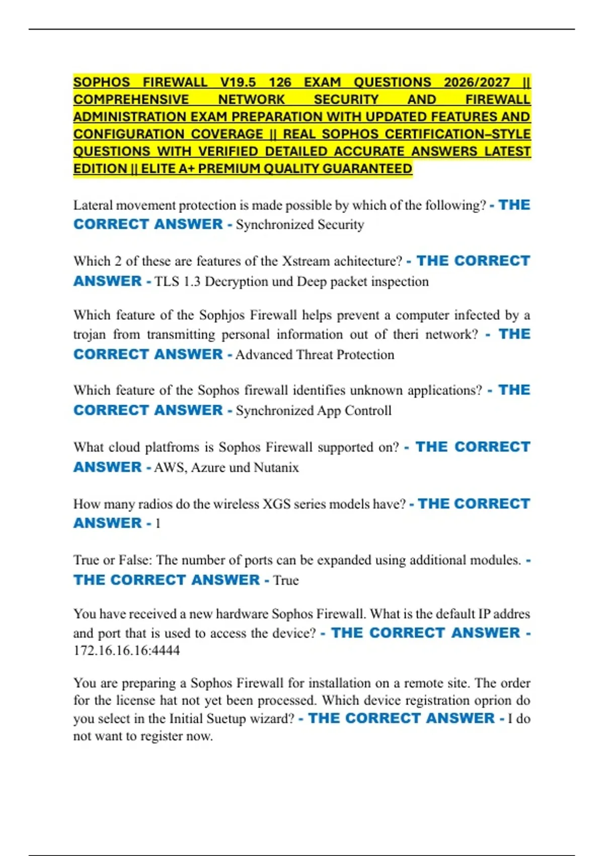 SOPHOS FIREWALL V19.5 126 EXAM QUESTIONS 2026/2027 || COMPREHENSIVE NETWORK SECURITY AND FIREWALL ADMINISTRATION EXAM PREPARATION WITH UPDATED FEATURES AND CONFIGURATION COVERAGE || REAL SOPHOS CERTIFICATION–STYLE QUESTIONS WITH VERIFIED DETAILED ACCURATE ANSWERS LATEST EDITION || ELITE A+ PREMIUM QUALITY GUARANTEED Lateral movement protection is made possible by which of the following? - THE CORRECT ANSWER - Synchronized Security Which 2 of these are features of the Xstream achitecture? - THE CORRECT ANSWER - TLS 1.3 Decryption und Deep packet inspection Which feature of the Sophjos Firewall helps prevent a computer infected by a trojan from transmitting personal information out of theri network? - THE CORRECT ANSWER - Advanced Threat Protection Which feature of the Sophos firewall identifies unknown applications? - THE CORRECT ANSWER - Synchronized App Controll What cloud platfroms is Sophos Firewall supported on? - THE CORRECT ANSWER - AWS, Azure und Nutanix