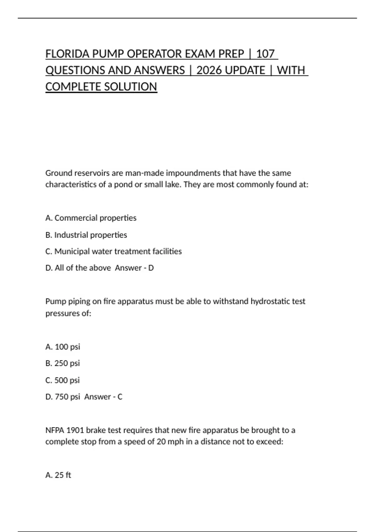 FLORIDA PUMP OPERATOR EXAM PREP | 107 QUESTIONS AND ANSWERS | 2026 UPDATE | WITH COMPLETE SOLUTION