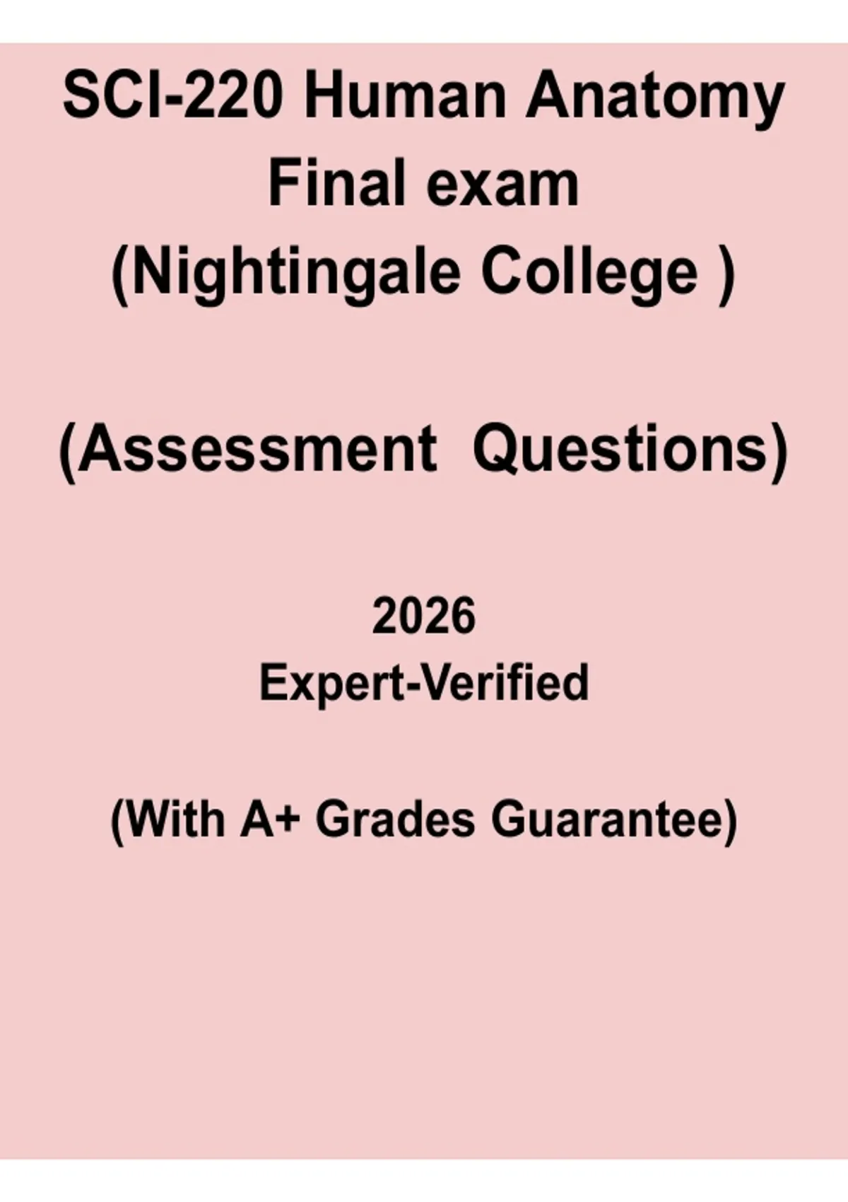 This SCI-220 Human Anatomy Final Exam PDF is a focused 2026 study resource designed to help Nightingale College students prepare effectively for the SCI-220 Human Anatomy final assessment. The document includes exam-style questions and targeted review content covering key anatomical structures, body systems, terminology, and clinical relevance essential for nursing students. Ideal for final revision, self-assessment, and exam readiness, this resource supports confident preparation and improved performance on the Nightingale College SCI-220 anatomy final exam.