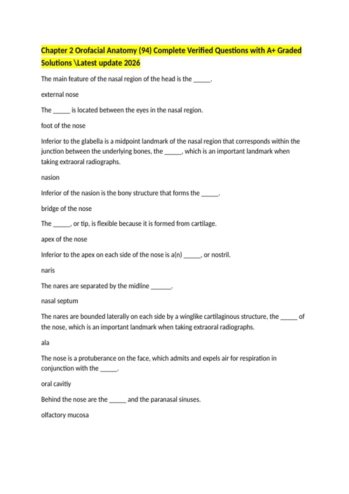 Chapter 2 Orofacial Anatomy (94) Complete Verified Questions with A+ Graded Solutions Latest update 2026 The main feature of the nasal region of the head is the _____. external nose The _____ is located between the eyes in the nasal region. foot of the nose Inferior to the glabella is a midpoint landmark of the nasal region that corresponds within the junction between the underlying bones, the _____, which is an important landmark when taking extraoral radiographs. nasion