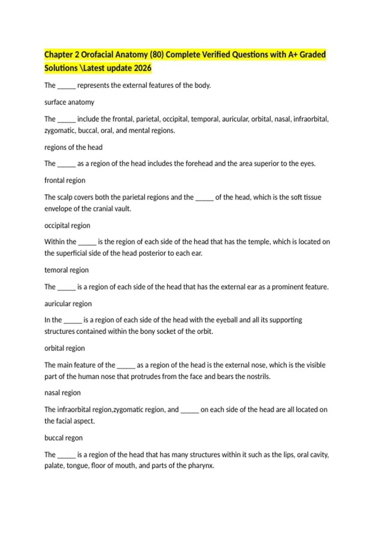 Chapter 2 Orofacial Anatomy (80) Complete Verified Questions with A+ Graded Solutions Latest update 2026 The _____ represents the external features of the body. surface anatomy The _____ include the frontal, parietal, occipital, temporal, auricular, orbital, nasal, infraorbital, zygomatic, buccal, oral, and mental regions. regions of the head The _____ as a region of the head includes the forehead and the area superior to the eyes. frontal region The scalp covers both the parietal regions and the _____ of the head, which is the soft tissue envelope of the cranial vault. occipital region Within the _____ is the region of each side of the head that has the temple, which is located on the superficial side of the head posterior to each ear. temoral region The _____ is a region of each side of the head that has the external ear as a prominent feature. auricular region In the _____ is a region of each side of the head with the eyeball and all its supporting structures contained within the bony socket of the orbit. orbital region The main feature of the _____ as a region of the head is the external nose, which is the visible part of the human nose that protrudes from the face and bears the nostrils.