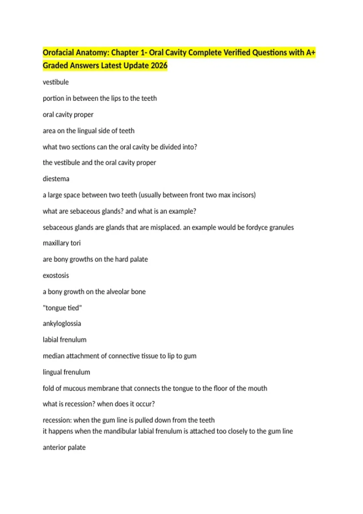 Orofacial Anatomy: Chapter 1- Oral Cavity Complete Verified Questions with A+ Graded Answers Latest Update 2026 vestibule portion in between the lips to the teeth oral cavity proper area on the lingual side of teeth what two sections can the oral cavity be divided into? the vestibule and the oral cavity proper diestema a large space between two teeth (usually between front two max incisors) what are sebaceous glands? and what is an example? sebaceous glands are glands that are misplaced. an example would be fordyce granules maxillary tori are bony growths on the hard palate exostosis a bony growth on the alveolar bone "tongue tied" ankyloglossia labial frenulum median attachment of connective tissue to lip to gum lingual frenulum fold of mucous membrane that connects the tongue to the floor of the mouth what is recession? when does it occur? recession: when the gum line is pulled down from the teeth it happens when the mandibular labial frenulum is attached too closely to the gum line anterior palate hard palate, bony structure