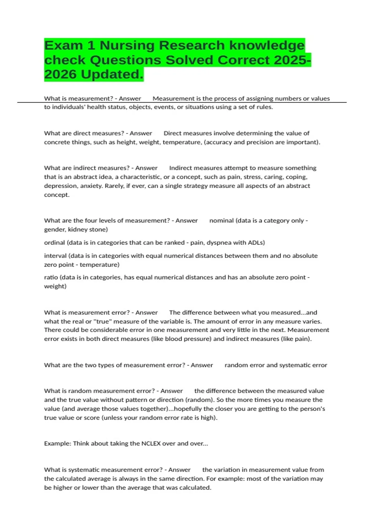 What is measurement? - Answer Measurement is the process of assigning numbers or values to individuals' health status, objects, events, or situations using a set of rules. What are direct measures? - Answer Direct measures involve determining the value of concrete things, such as height, weight, temperature, (accuracy and precision are important). What are indirect measures? - Answer Indirect measures attempt to measure something that is an abstract idea, a characteristic, or a concept, such as pain, stress, caring, coping, depression, anxiety. Rarely, if ever, can a single strategy measure all aspects of an abstract concept. What are the four levels of measurement? - Answer nominal (data is a category only - gender, kidney stone) ordinal (data is in categories that can be ranked - pain, dyspnea with ADLs) interval (data is in categories with equal numerical distances between them and no absolute zero point - temperature) ratio (data is in categories, has equal numerical distances and has an absolute zero point - weight) What is measurement error? - Answer The difference between what you measured...and what the real or "true" measure of the variable is. The amount of error in any measure varies. There could be considerable error in one measurement and very little in the next. Measurement error exists in both direct measures (like blood pressure) and indirect measures (like pain). What are the two types of measurement error? - Answer random error and systematic error What is random measurement error? - Answer the difference between the measured value and the true value without pattern or direction (random). So the more times you measure the value (and average those values together)...hopefully the closer you are getting to the person's true value or score (unless your random error rate is high). Example: Think about taking the NCLEX over and over...