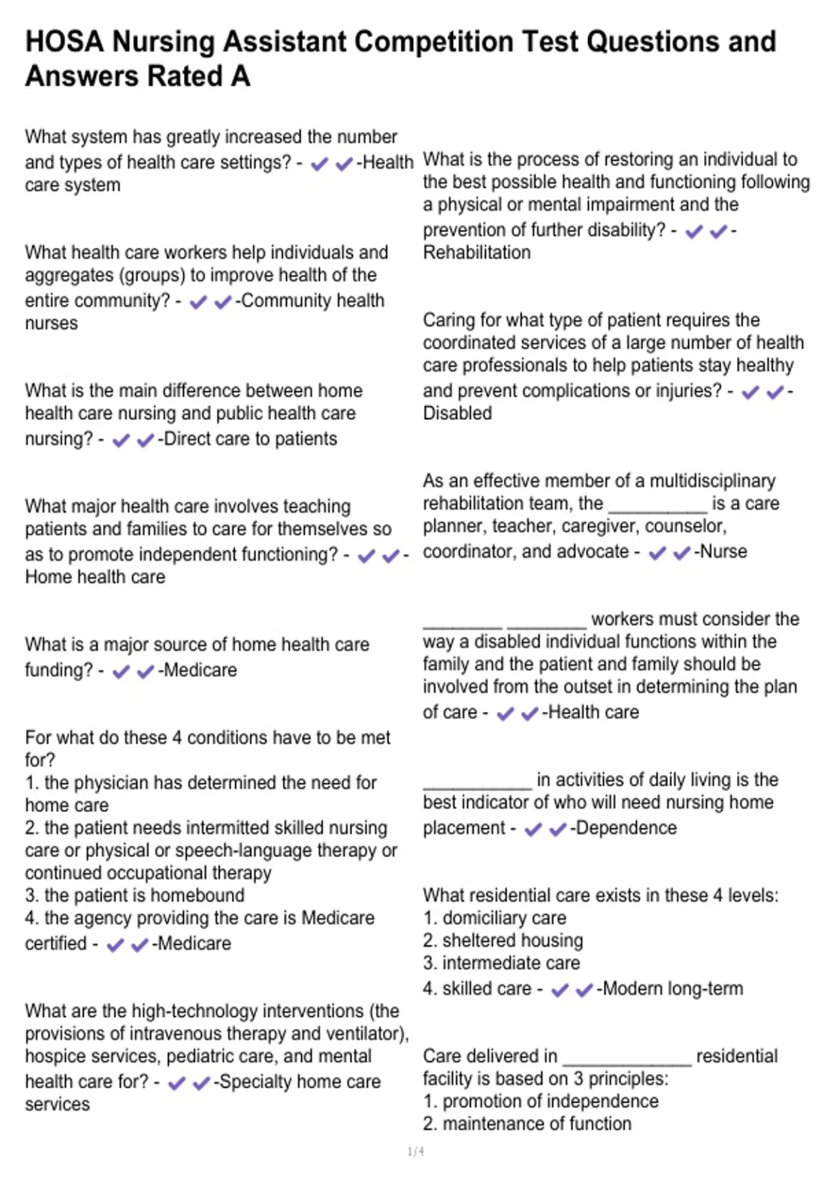 HOSA Nursing Assistant Competition Test Questions and Answers Rated A