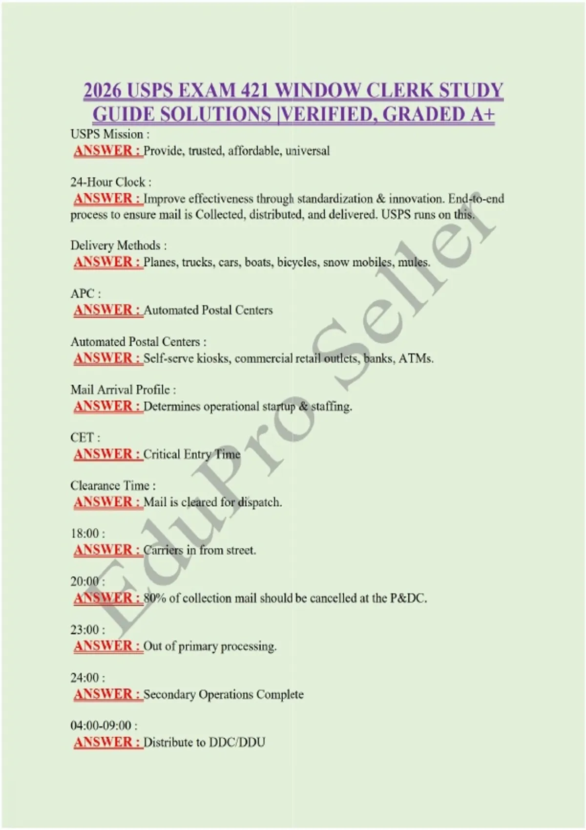 2026 USPS EXAM 421 WINDOW CLERK STUDY GUIDE SOLUTIONS |VERIFIED, GRADED A+ 2025/2026