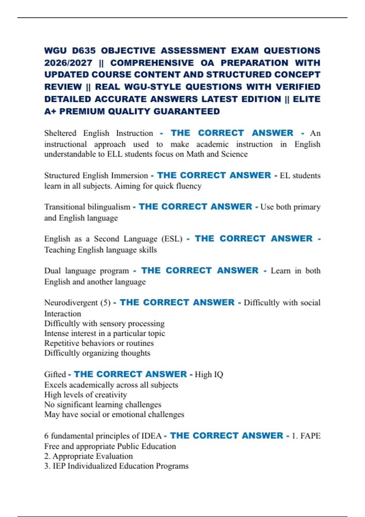 WGU D635 OBJECTIVE ASSESSMENT EXAM QUESTIONS 2026/2027 || COMPREHENSIVE OA PREPARATION WITH UPDATED COURSE CONTENT AND STRUCTURED CONCEPT REVIEW || REAL WGU-STYLE QUESTIONS WITH VERIFIED DETAILED ACCURATE ANSWERS LATEST EDITION || ELITE A+ PREMIUM QUALITY GUARANTEED Sheltered English Instruction - THE CORRECT ANSWER - An instructional approach used to make academic instruction in English understandable to ELL students focus on Math and Science Structured English Immersion - THE CORRECT ANSWER - EL students learn in all subjects. Aiming for quick fluency Transitional bilingualism - THE CORRECT ANSWER - Use both primary and English language English as a Second Language (ESL) - THE CORRECT ANSWER - Teaching English language skills Dual language program - THE CORRECT ANSWER - Learn in both English and another language Neurodivergent (5) - THE CORRECT ANSWER - Difficultly with social Interaction Difficultly with sensory processing Intense interest in a particular topic Repetitive behaviors or routines Difficultly organizing thoughts