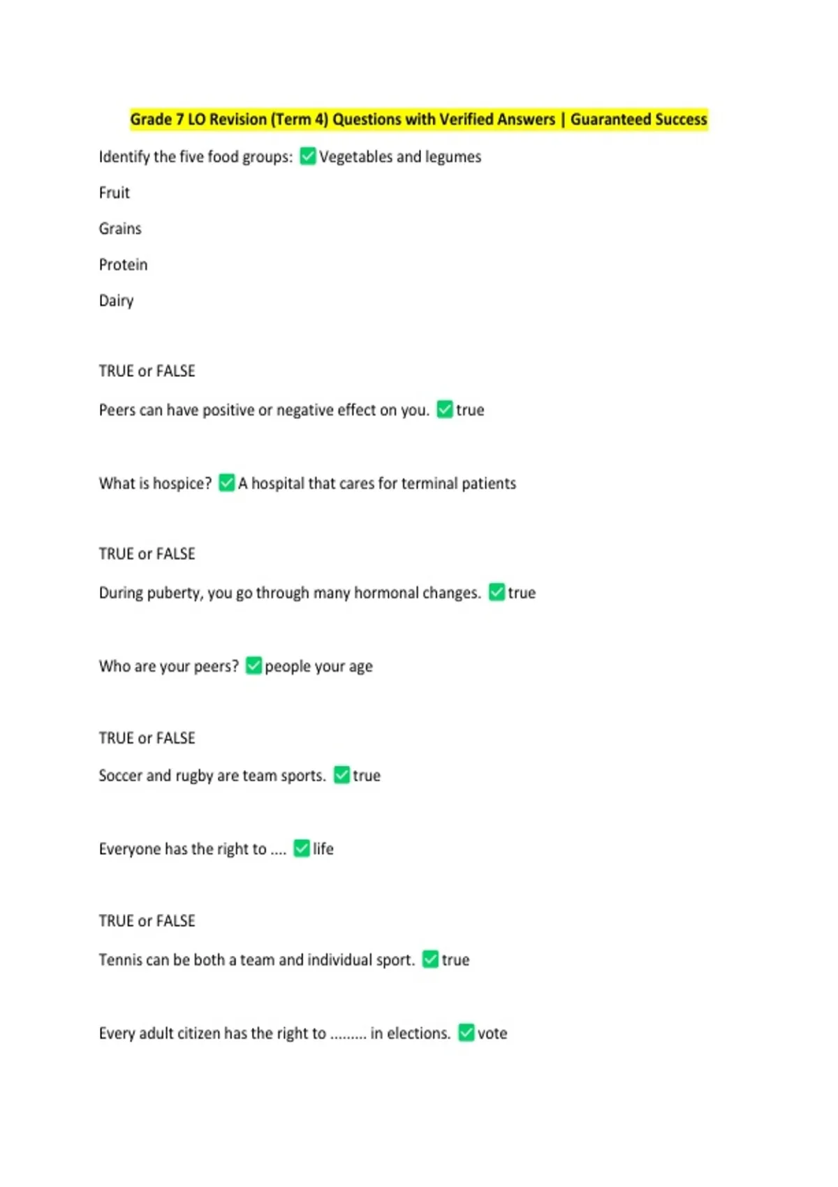 Grade 7 LO Revision (Term 4) Questions with Verified Answers | Guaranteed Success