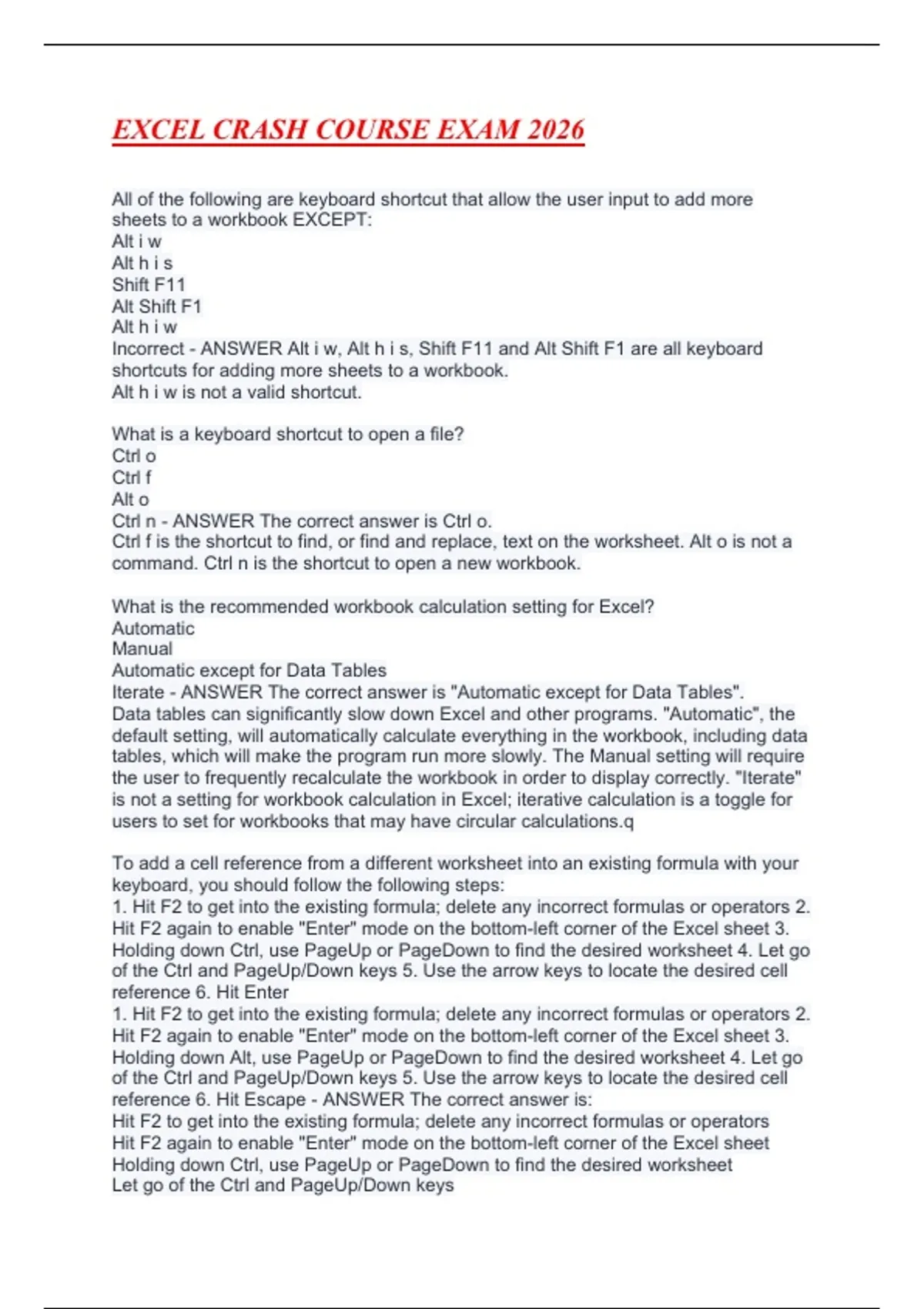 Excel Crash Course Exam, 2026 — complete exam questions with correct answers
