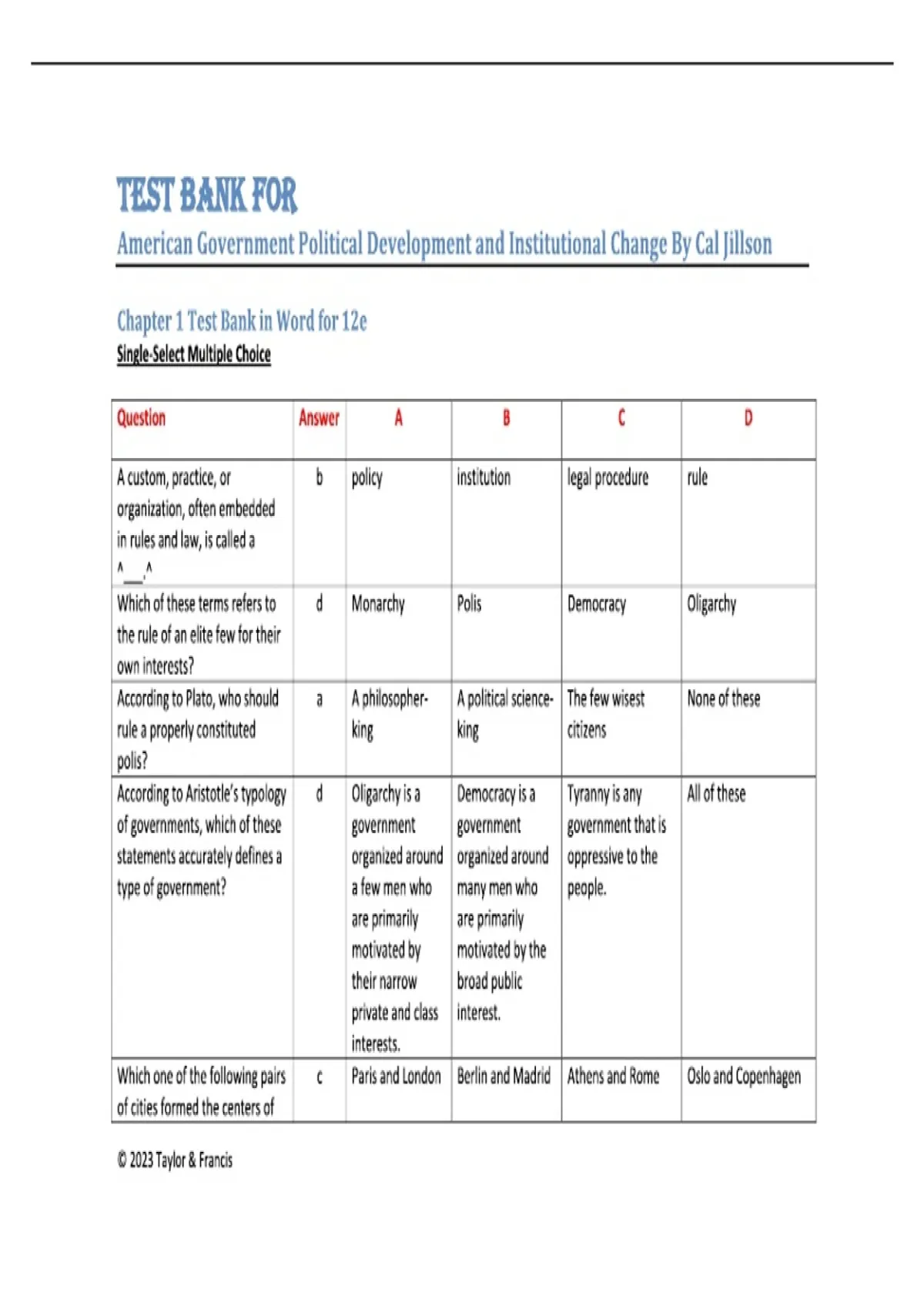 Test Bank for American Government Political Development and Institutional Change By Cal Jillson