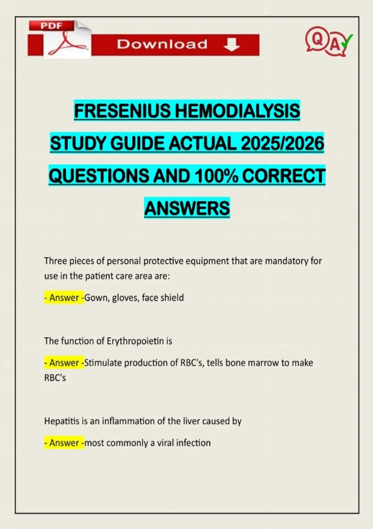 FRESENIUS HEMODIALYSIS STUDY GUIDE ACTUAL 2025/2026 QUESTIONS AND 100% CORRECT ANSWERS Three pieces of personal protective equipment that are mandatory for use in the patient care area are: - Answer -Gown, gloves, face shield The function of Erythropoietin is - Answer -Stimulate production of RBC's, tells bone marrow to make RBC's Hepatitis is an inflammation of the liver caused by - Answer -most commonly a vi