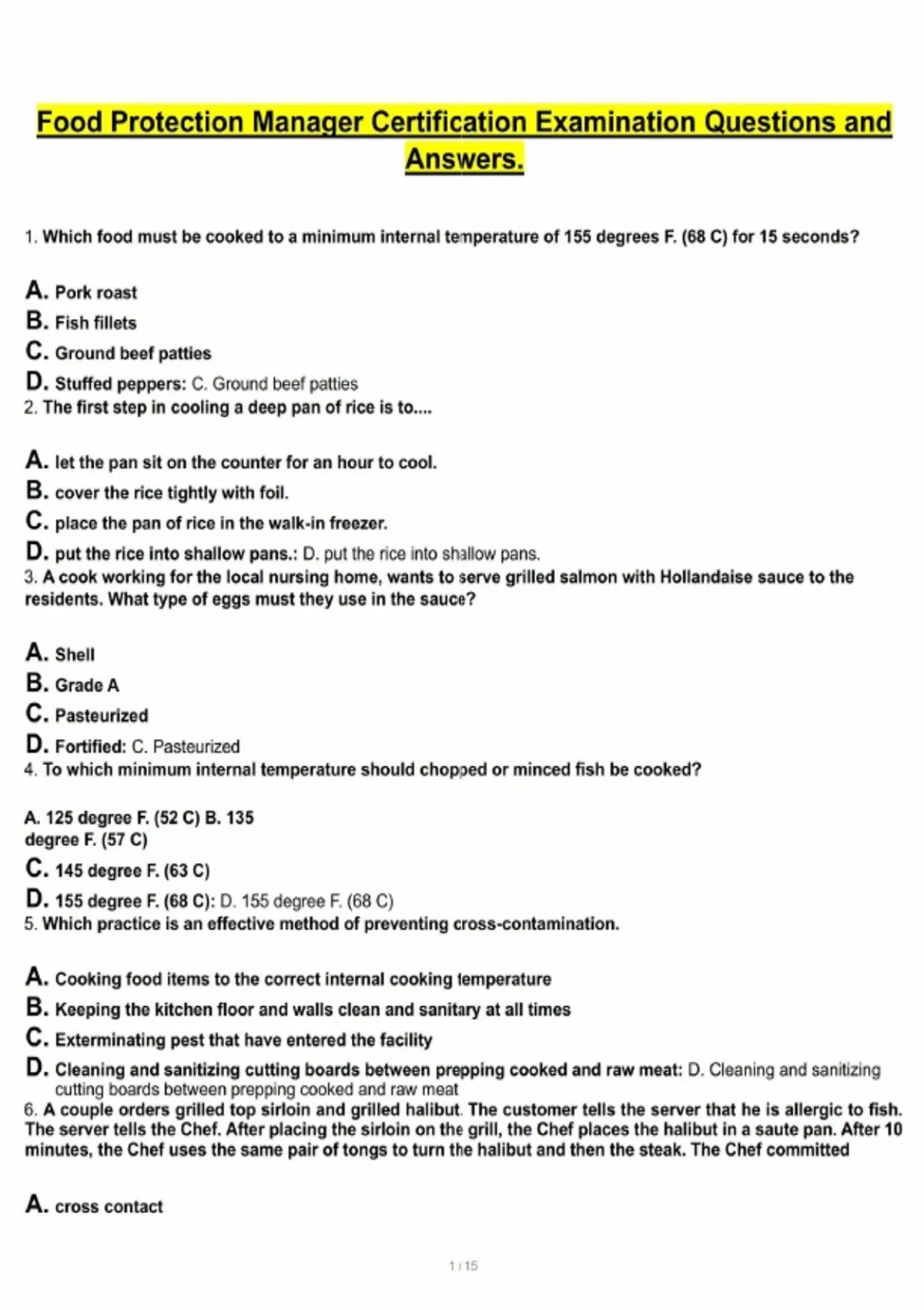 Food Protection Manager Certification Examination Questions and Answers.Food Protection Manager Certification Examination Questions and Answers.