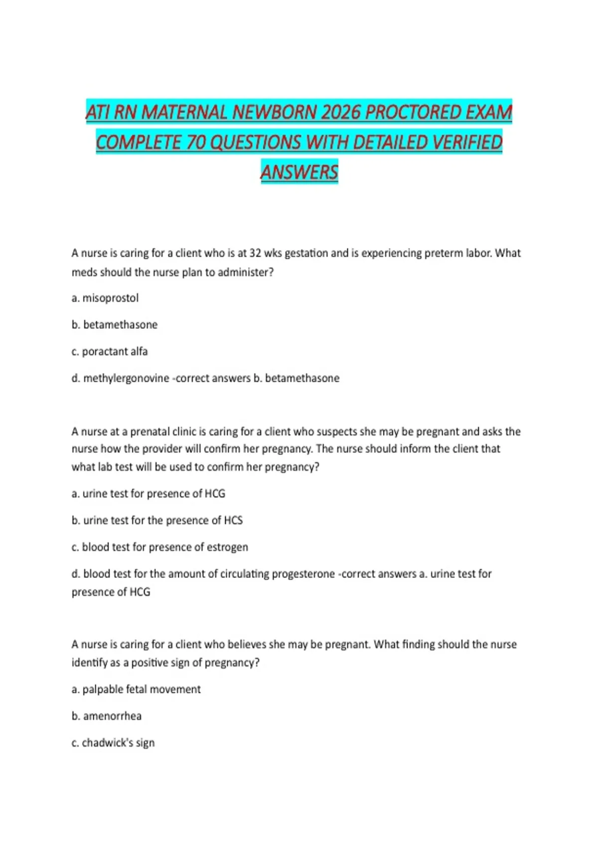 ATI RN MATERNAL NEWBORN 2026 PROCTORED EXAM COMPLETE 70 QUESTIONS WITH DETAILED VERIFIED ANSWERS
