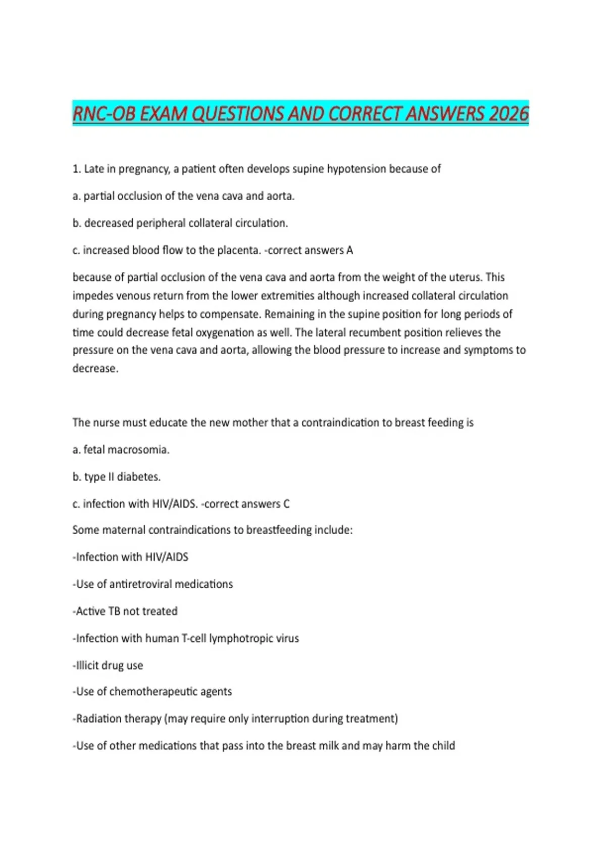 1. Late in pregnancy, a patient often develops supine hypotension because of a. partial occlusion of the vena cava and aorta. b. decreased peripheral collateral circulation. c. increased blood flow to the placenta. -correct answers A because of partial occlusion of the vena cava and aorta from the weight of the uterus. This impedes venous return from the lower extremities although increased collateral circulation during pregnancy helps to compensate. Remaining in the supine position for long periods of time could decrease fetal oxygenation as well. The lateral recumbent position relieves the pressure on the vena cava and aorta, allowing the blood pressure to increase and symptoms to decrease. The nurse must educate the new mother that a contraindication to breast feeding is a. fetal macrosomia. b. type II diabetes. c. infection with HIV/AIDS. -correct answers C