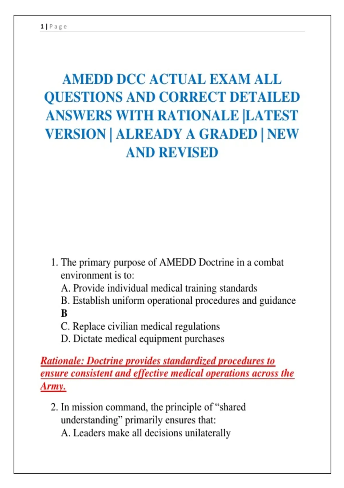 AMEDD DCC ACTUAL EXAM ALL QUESTIONS AND CORRECT DETAILED ANSWERS WITH RATIONALE |LATEST VERSION | ALREADY A GRADED | NEW AND REVISED