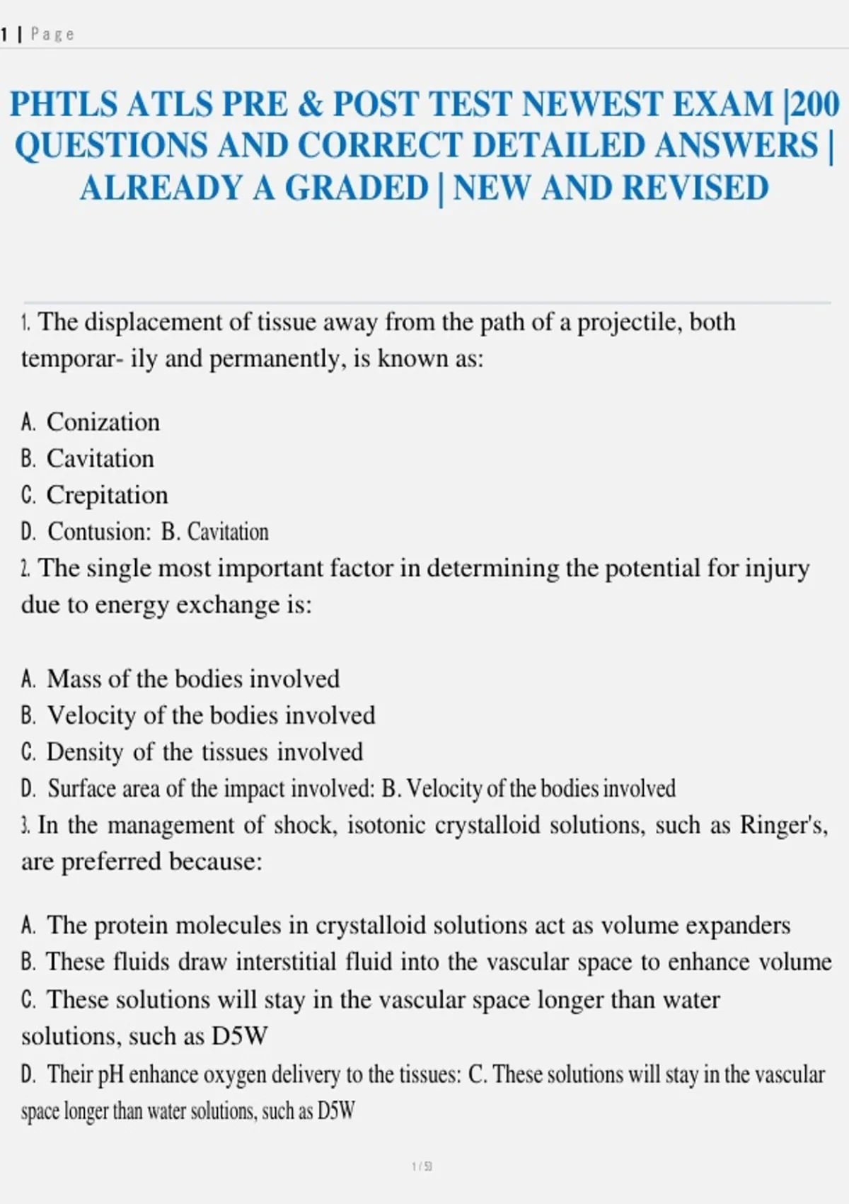 PHTLS ATLS PRE & POST TEST NEWEST EXAM |200