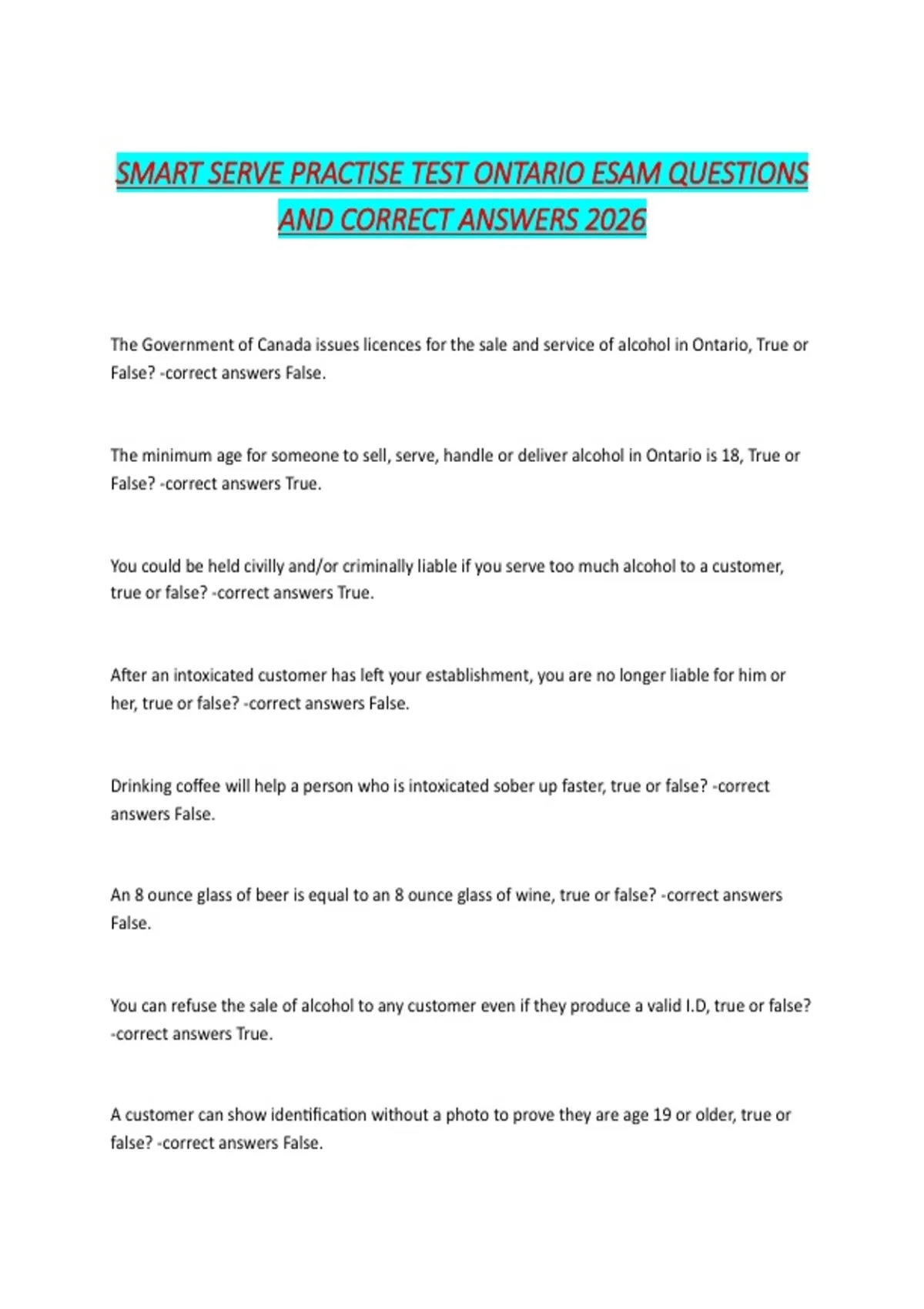 The minimum age for someone to sell, serve, handle or deliver alcohol in Ontario is 18, True or