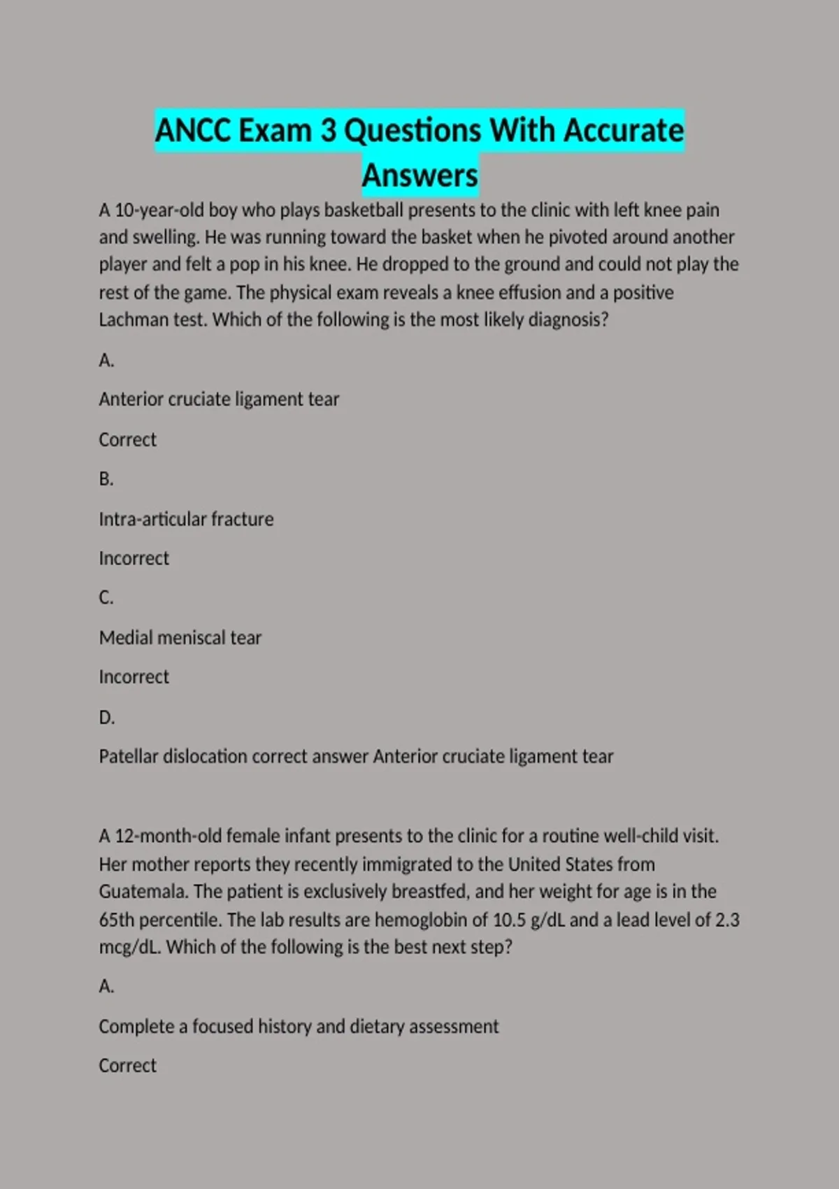 A 10-year-old boy who plays basketball presents to the clinic with left knee pain and swelling. He was running toward the basket when he pivoted around another player and felt a pop in his knee. He dropped to the ground and could not play the rest of the game. The physical exam reveals a knee effusion and a positive Lachman test. Which of the following is the most likely diagnosis? A. Anterior cruciate ligament tear Correct B. Intra-articular fracture Incorrect C. Medial meniscal tear Incorrect D. Patellar dislocation correct answer Anterior cruciate ligament tear A 12-month-old female infant presents to the clinic for a routine well-child visit. Her mother reports they recently immigrated to the United States from Guatemala. The patient is exclusively breastfed, and her weight for age is in the 65th percentile. The lab results are hemoglobin of 10.5 g/dL and a lead level of 2.3 mcg/dL. Which of the following is the best next step? A. Complete a focused history and dietary assessment Correct