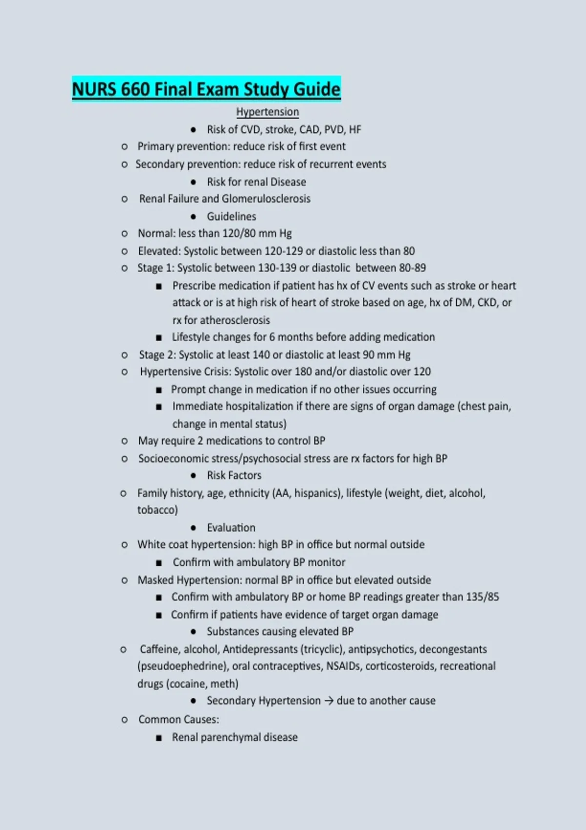 Hypertension ● Risk of CVD, stroke, CAD, PVD, HF ○ Primary prevention: reduce risk of first event ○ Secondary prevention: reduce risk of recurrent events ● Risk for renal Disease ○ Renal Failure and Glomerulosclerosis ● Guidelines ○ Normal: less than 120/80 mm Hg ○ Elevated: Systolic between 120-129 or diastolic less than 80 ○ Stage 1: Systolic between 130-139 or diastolic between 80-89 ■ Prescribe medication if patient has hx of CV events such as stroke or heart attack or is at high risk of heart of stroke based on age, hx of DM, CKD, or rx for atherosclerosis ■ Lifestyle changes for 6 months before adding medication ○ Stage 2: Systolic at least 140 or diastolic at least 90 mm Hg ○ Hypertensive Crisis: Systolic over 180 and/or diastolic over 120 ■ Prompt change in medication if no other issues occurring ■ Immediate hospitalization if there are signs of organ damage (chest pain, change in mental status) ○ May require 2 medications to control BP ○ Socioeconomic stress/psychosocial stress are rx factors for high BP ● Risk Factors ○ Family history, age, ethnicity (AA, hispanics), lifestyle (weight, diet, alcohol, tobacco) ● Evaluation ○ White coat hypertension: high BP in office but normal outside ■ Confirm with ambulatory BP monitor ○ Masked Hypertension: normal BP in office but elevated outside ■ Confirm with ambulatory BP or home BP readings greater than 135/85 ■ Confirm if patients have evidence of target organ damage