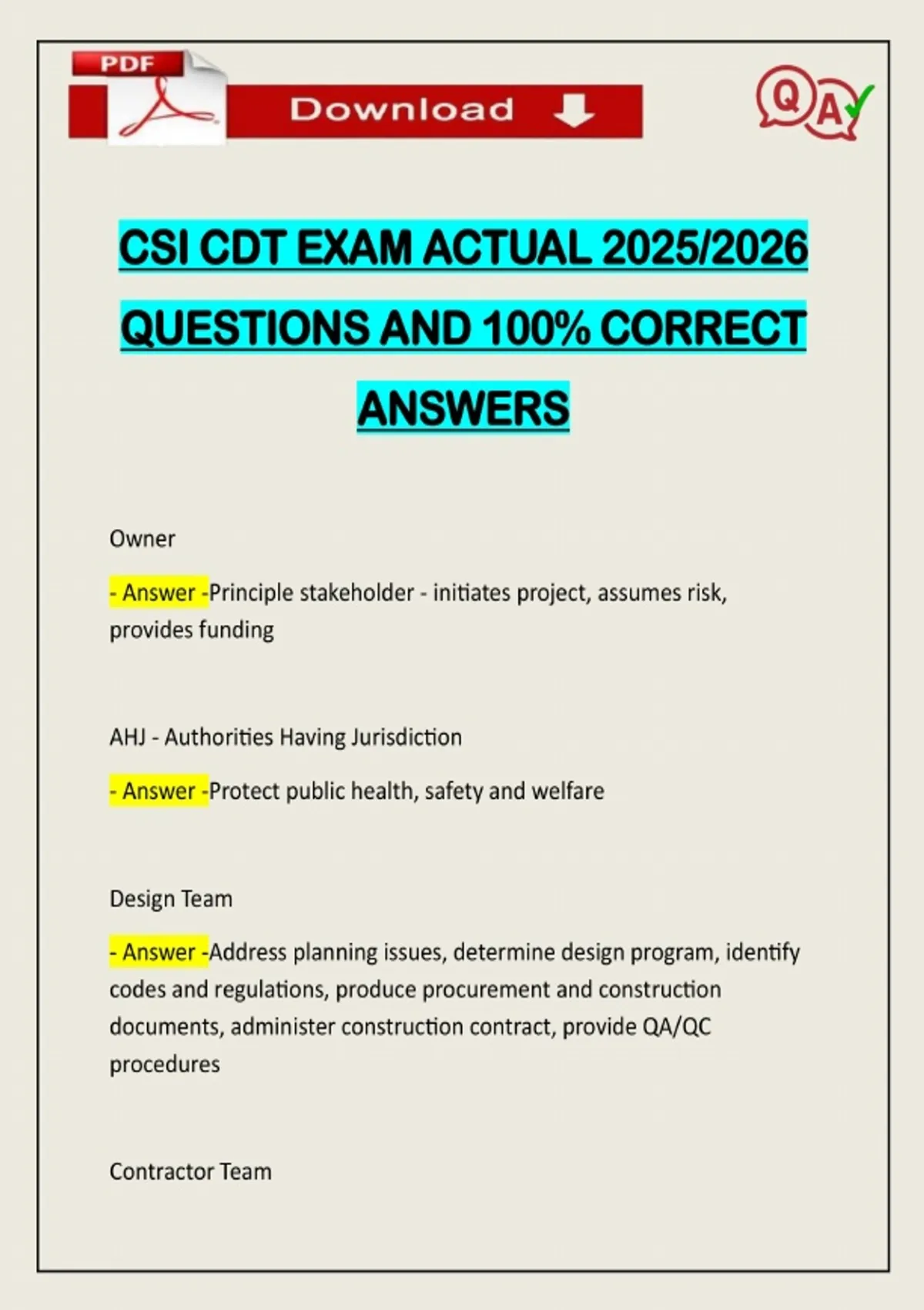 CSI CDT EXAM ACTUAL 2025/2026 QUESTIONS AND 100% CORRECT ANSWERS Owner - Answer -Principle stakeholder - initiates project, assumes risk, provides funding AHJ - Authorities Having Jurisdiction - Answer -Protect public health, safety and welfare Design Team - Answer -Address planning issues, determine design program, identify codes and regulations, produce procurement and construction documents, administer construction contract, provide QA/QC procedures Contractor Team